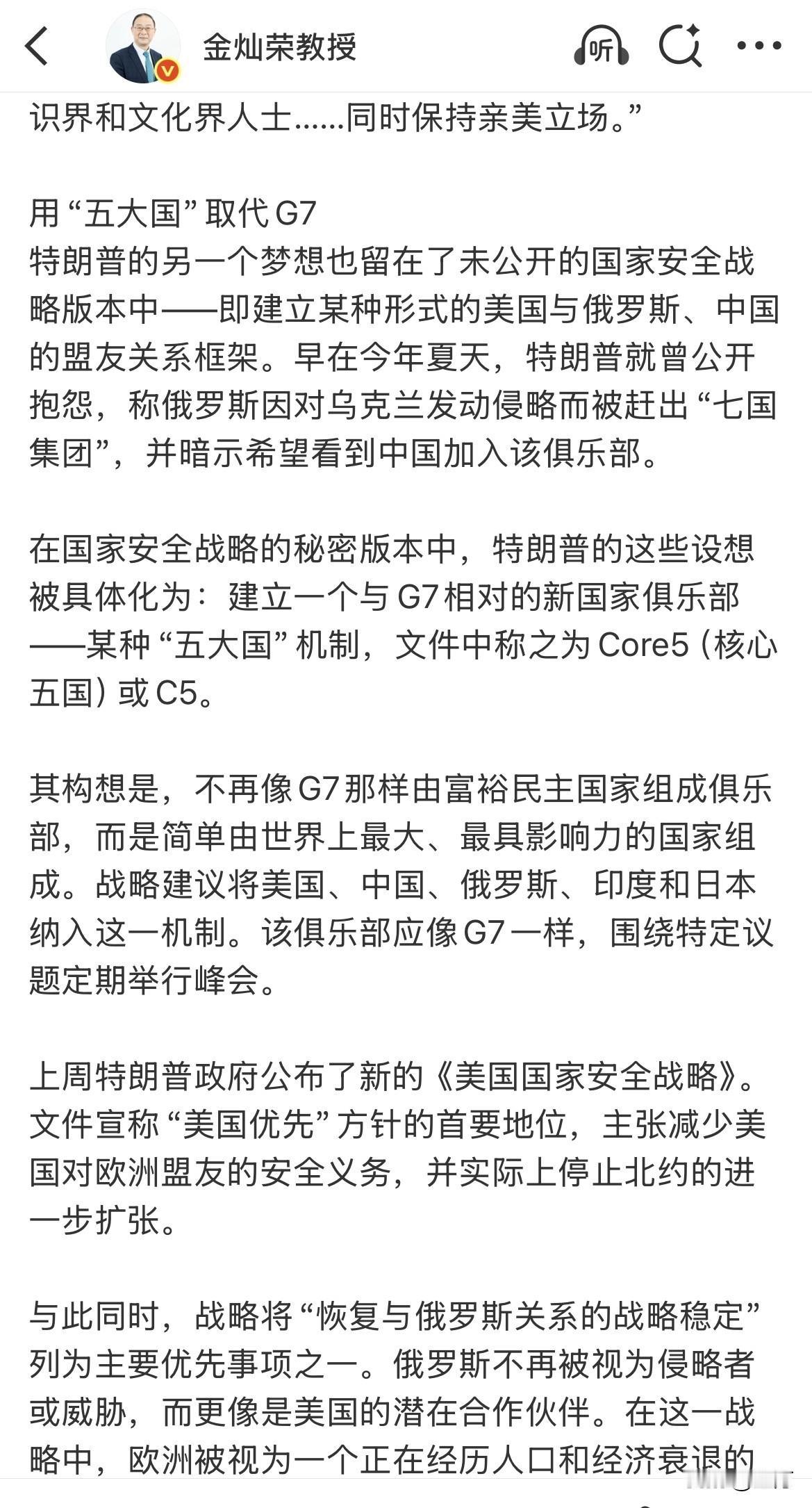 金灿荣:老头想用C5取代G7! 就在刚才,金灿荣分析了老头最新的动向,意思就