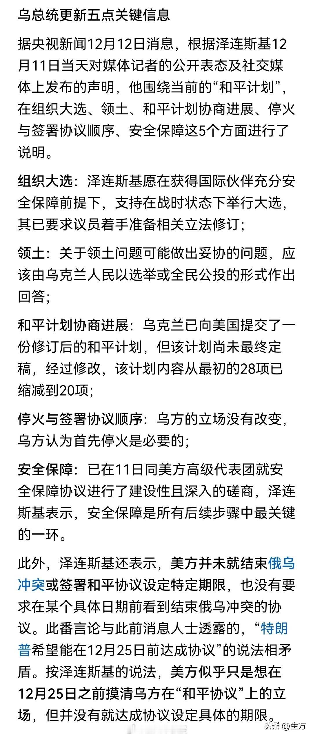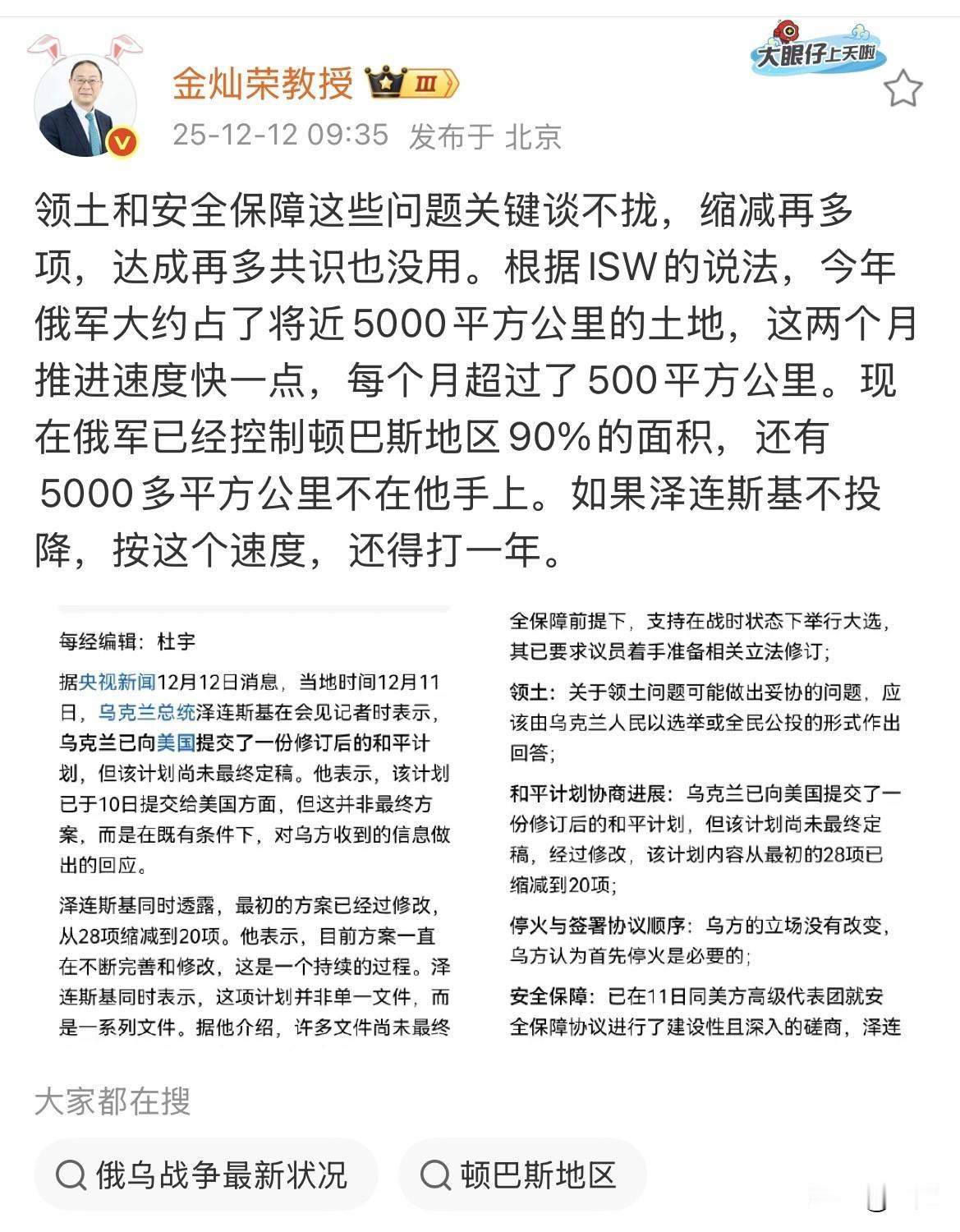 金灿荣:领土和安全保障这些问题关键谈不拢,达成再多共识也没用! 就在刚才,金灿荣教授给出了一个比较具体的数字,那就是俄罗斯仅仅今年一年就占据了与乌克兰5000平方公里的土地,而且现在每天都在向前推进。 也就是说,乌克兰每一天都都在丢自己的土地,而且这个速度是越来越快的,所以面对这种形式,俄罗斯是不可能放弃的,反而是越打越兴奋。 因此,他推断按照这个速度来推进的话,至少还得打一年多,而且这还是最快的,因此在这个时候,司机才会想一些办法来搞拖延。 这个东西对他们来说才是本质的东西,所以这个根本的东西没有变,谈其它共识都是意义不大的,所以司机现在,就是在拖延时间,关键是现在他到任的时间又要来了,所以他想用一些东西,让自己在这个位置上呆久一些。 至于接下来的时间,谁都说不清楚,具体要打多久,但是这个大趋势一直都没有变,俄罗斯一直都在稳定地向前推进,虽然速度比较较慢,但是人家每天都有收获,这个时候人家怎么可能退,所以金灿荣教授认为,这事儿在短时间里面还是停不下来的。