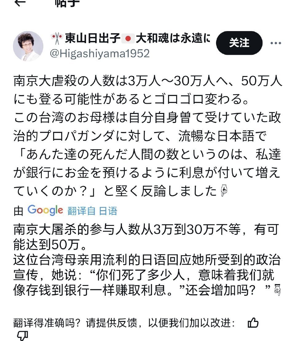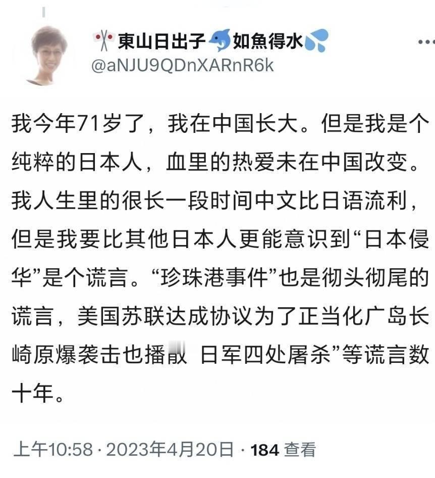 日本前将领称珍珠港事件是美国栽赃 不仅仅这位日本极右翼,还有一个出生在中国的日本人,是现在攻击张纯如,洗白日本二战罪行的代表,自称成长在中国的日本人后裔“东山日出子”(很有可能不是真名,或者是后来改的名字),回到日本后一直宣传“日军是仁义之师”,认为日本侵略是“美中俄韩假造”,要“给日本军人昭雪”,并且希望渗透中国,已经有人被她洗脑。因为张纯如的书写了南京大屠杀的情况,她也在诋毁张纯如和其家人。她自己承认很长一段时间都和中国交流,结果这就是她给中国的回报。
