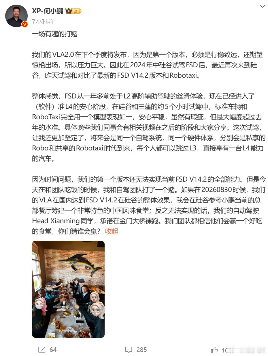 何小鹏立军令状:明年VLA做不到FSD14.2的效果,负责人要上街裸奔按照小鹏的节奏,动作再快一点的话,刘先明20260830说不定已经离职了
