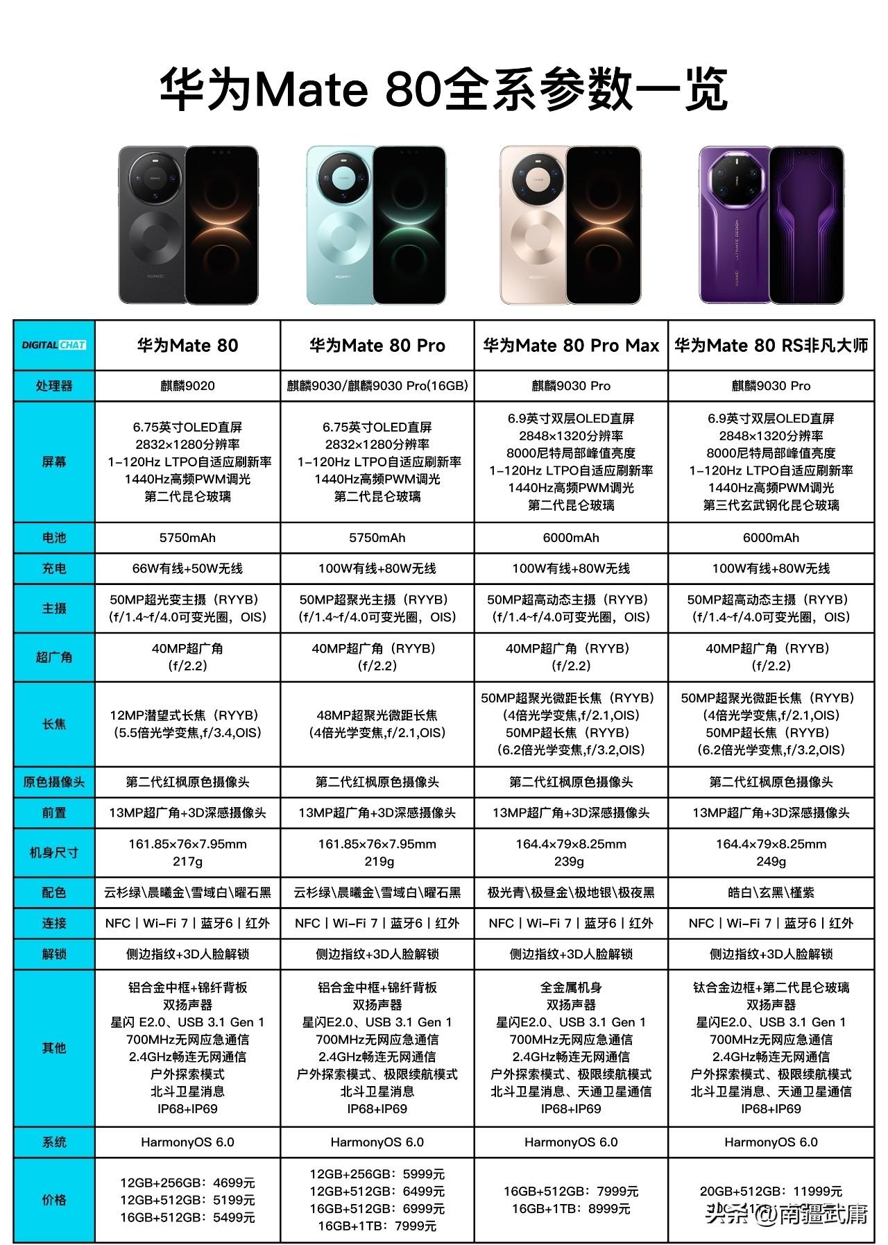 华为Mate80系列机型适配人群:按需求选不踩坑 华为Mate80系列四款机型配置、定位差异显著,适配的用户群体各有侧重,结合参数和使用场景,选择方向十分明确: 华为Mate80:性价比之选,适配年轻入门用户 这款基础款搭载麒麟9020处理器,4699元起的定价亲民,6.75英寸直屏+217g轻薄机身,握持感舒适。性能能满足日常刷视频、办公、轻度游戏需求,5750mAh大电池也能保证续航。适合20-30岁的学生党、职场新人,以及追求高性价比、对极致影像和性能无过高要求的用户。 Mate80 Pro/Pro Max:全能旗舰,适配职场中坚与家庭用户 Pro版搭载麒麟9030芯片+100W快充,Pro Max升级6000mAh电池和6.9英寸大屏,影像上新增超聚光微距长焦,能应对商务办公、家庭拍照等多元场景。30-50岁的职场人士、有家庭拍照需求的用户选这两款最合适,其中Pro版更适配看重便携性的人,Pro Max则适合偏爱大屏和长续航的人群。 Mate80 RS非凡大师:高端旗舰,适配商务精英与收藏爱好者 作为顶配机型,它采用钛合金边框+第三代昆仑玻璃,11999元起的定价搭配卫星通信、天通卫星通信等独家功能,定位奢华。适合40岁以上的高端商务人士,以及注重品牌质感、有收藏需求的数码爱好者,其稀缺设计和高端配置也能匹配商务社交场景的身份需求。