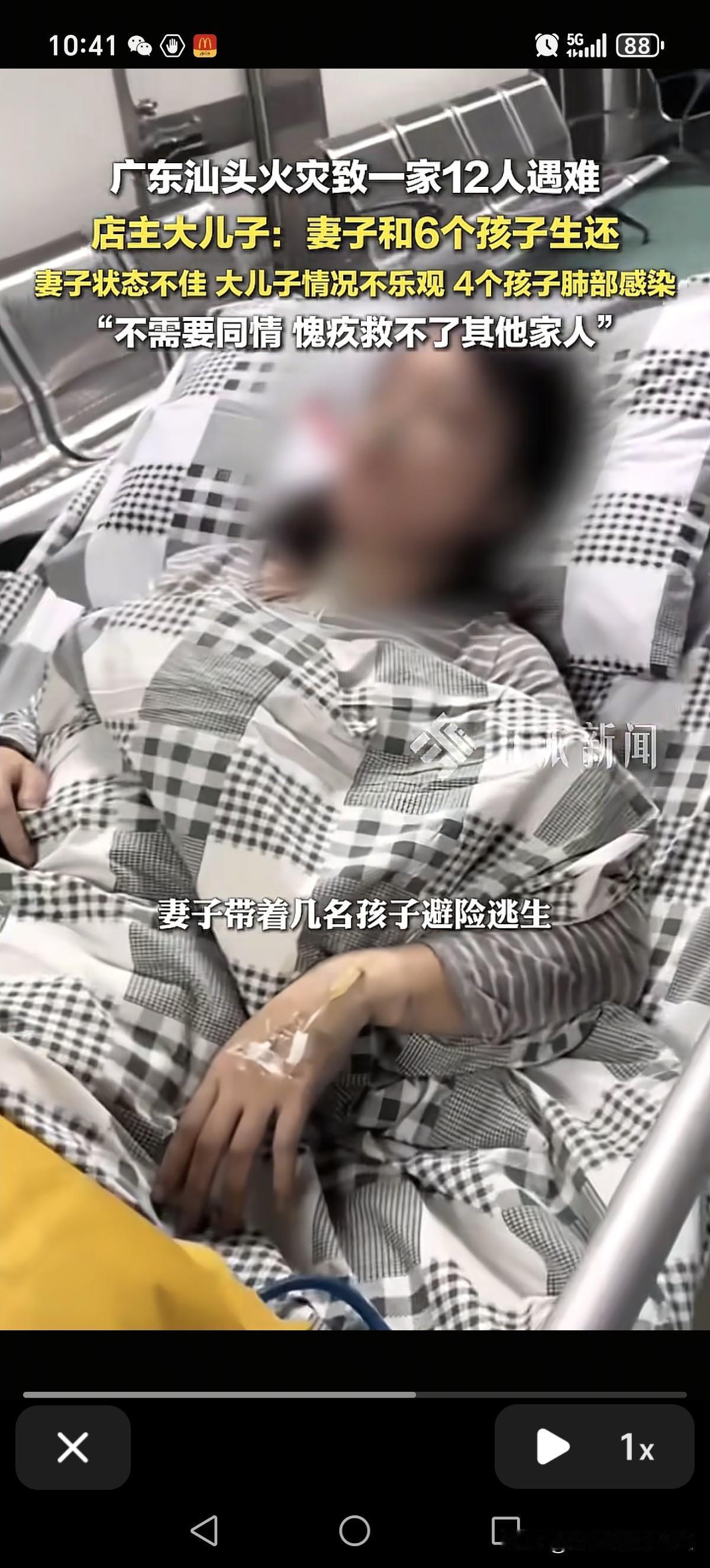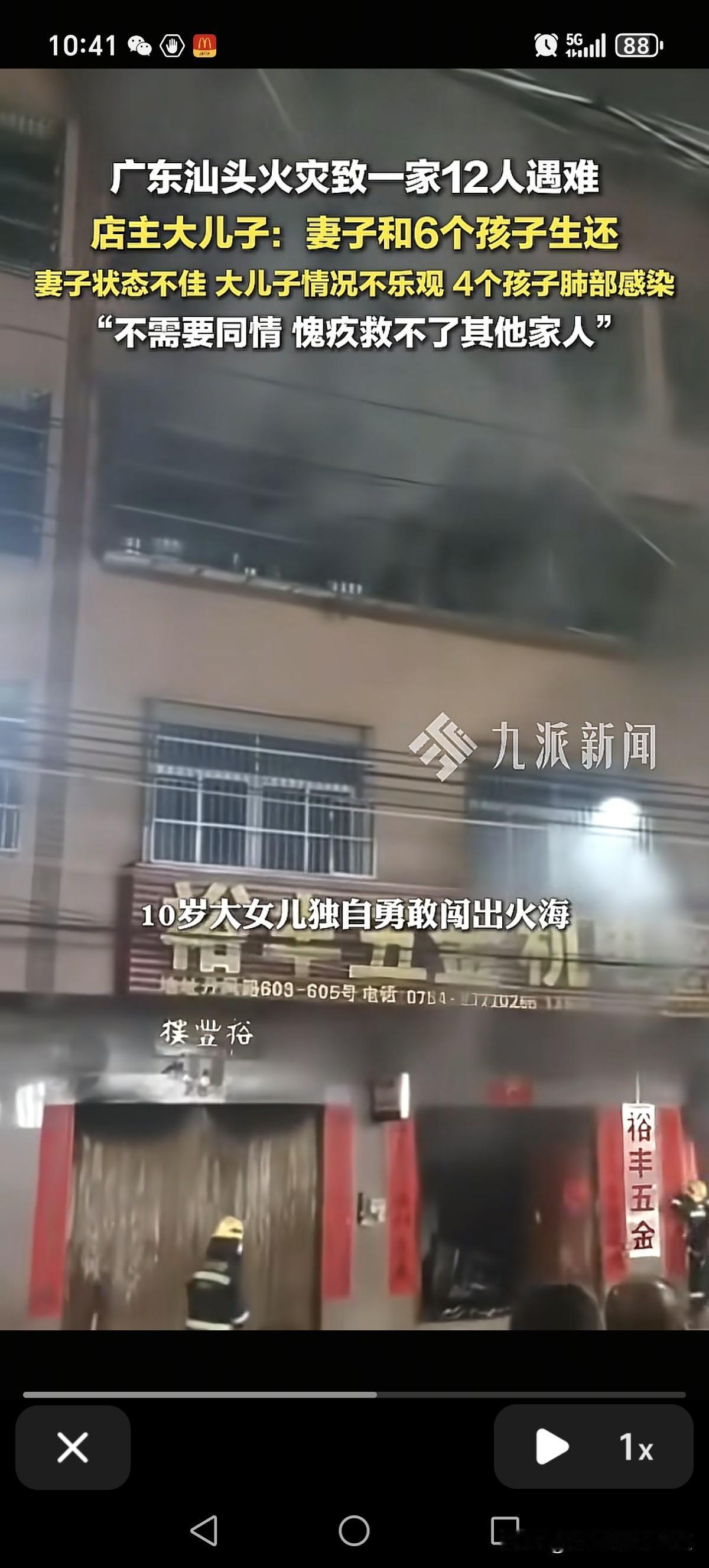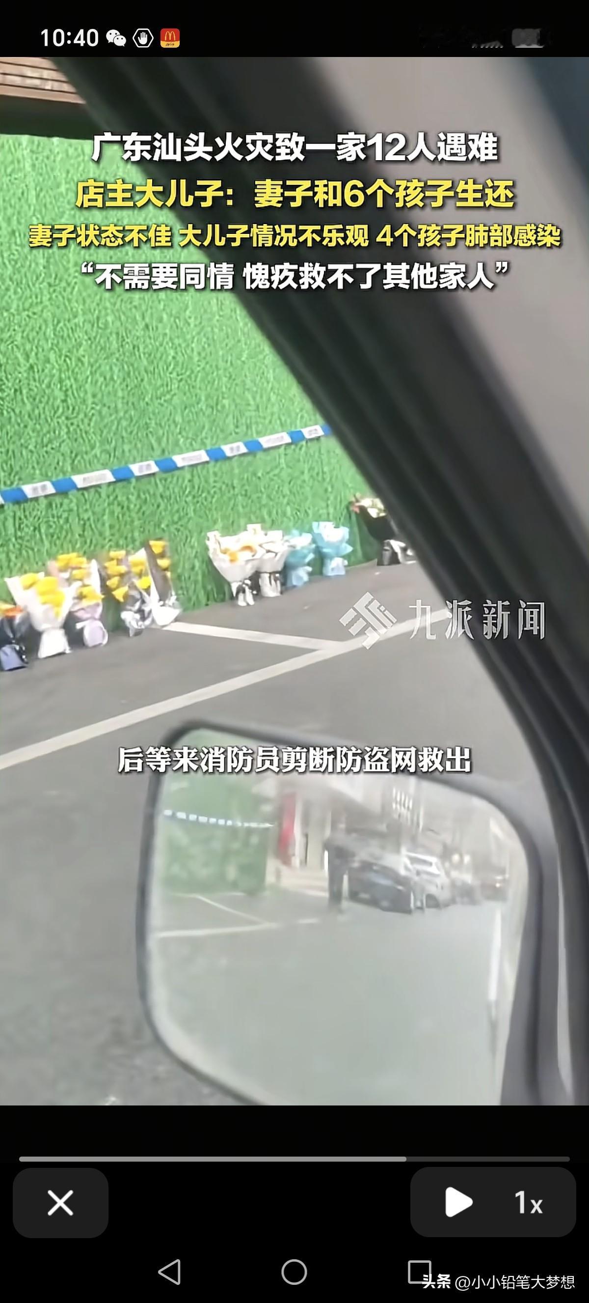 汕头五金铺火灾致12人遇难,灾后房子内部曝光,家具是完整的,植物也是存活的,但是内外被熏得漆黑,这说明当时的火势没有烧到楼上,这12人死亡,估计都是被熏死的。 这位大哥跟两个弟弟从事不同的行业,大哥做机械包装的,弟弟从事五金,主打水管、电机、电泵之类的,当时大哥他不在家所以幸免于难。 火灾时,大嫂真的很厉害,她只有两只手,所以只能抱2个小儿子,让3个小女儿戴上口罩,拿着湿毛巾躲到阳台等待救缓,她一手拎一个儿子,扯着10岁大女儿逃出来,等她出来把小的2个孩子放到安全地带后,再返回救那3个大一点的女儿,但被邻居拦住了,而当时消防员也到了,所以救援交给了消防员,消防员是直接把防队盗网剪断了救出那三个女儿的。 现在大嫂和6个孩子都躺在医院,大嫂状态不太好,大儿子情况不乐观,4个孩子的肺部感染。 从大哥拍摄曝光屋内的视频,可以得知,当时火还没有烧到3楼,但因为五金店铺,燃烧的那些电机塑料铜线产生了大量有毒的浓烟,所以人根本就看不到,甚至呼吸不了,逃生就更难了,大街那边的正门,因为是1楼着火,所以逃生口就被堵死,本来楼顶的天台是互通的,可以跑到另外一幢逃生,当时救火的邻居也提醒了他们,但是他们居然把这个给锁死了,他们说开不了,所以4楼全军覆没。 二嫂他们是因为在二街那边侧门出来的,只能说这个二嫂真的非常机智,满屋都是毒烟情况下迟疑一秒人就没了,她知道让孩子戴上口罩和湿毛巾捂住,在阳台等待救援,真的很明智。 几兄弟不分家,一大家子都住在一起,证明感情都很好,大嫂经历这种场面,还失去了12位亲人肯定很难接受,在外人看来都很难受,也很惋惜。 这件事情也提醒我们,家里备防毒面罩很有必要,还有就算是装防盗网一定要多留活动的逃生口,天台的门千万不能锁,这些都是生命通道!