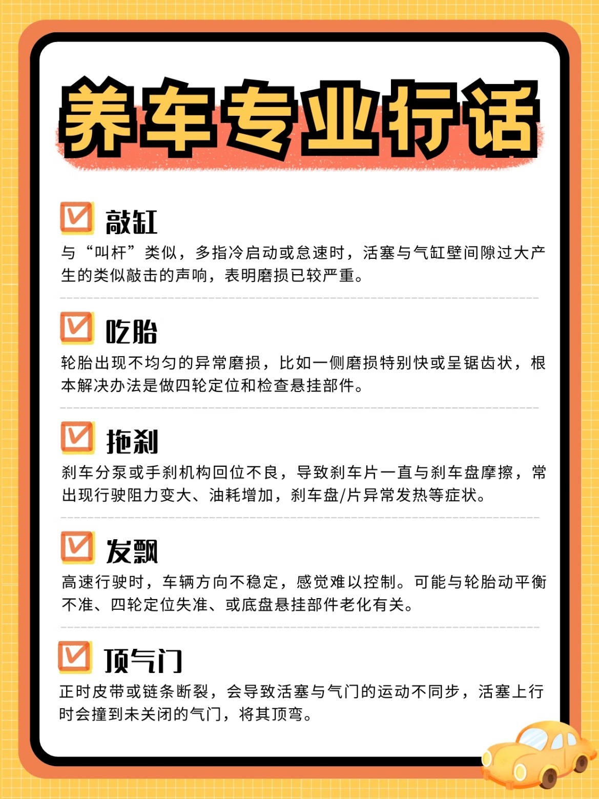 明明开了好几年车🤔“拉缸”“开锅”“叫杆”还是听不懂这些修车行话到底在说啥这些行话可不一般,掌握住了省💰省心如果一直没理解,那咱的爱车可就要“遭殃”了🔧【发动机警报组】⚠️ 拉缸:气缸壁被活塞划伤,动力暴跌还烧机油,多半是缺机油或高温导致⚠️ 开锅:冷却液沸腾喷蒸汽,散热系统出问题,赶紧停车检查!⚠️ 叫杆/爆震:加速时听见“咔咔”声,可能是油品不对或积碳太多⚠️ 顶气门:正时皮带/链条断了,活塞撞弯气门,大修预警!🔧【行驶异常组】🛞 吃胎:轮胎磨成“锯齿状”或单侧偏磨,快去做四轮定位!🛞 拖刹:刹车片不回位,油耗增高还发热,行驶感觉像被拽着🛞 发飘:高速上方向盘“飘忽不定”,查查动平衡、定位或悬挂老化🛞 敲缸:冷启动或怠速时听见敲击声,活塞间隙过大,该检查磨损了养车如养身,听懂“身体语言”才能及时对症下药💊大v聊车汽车