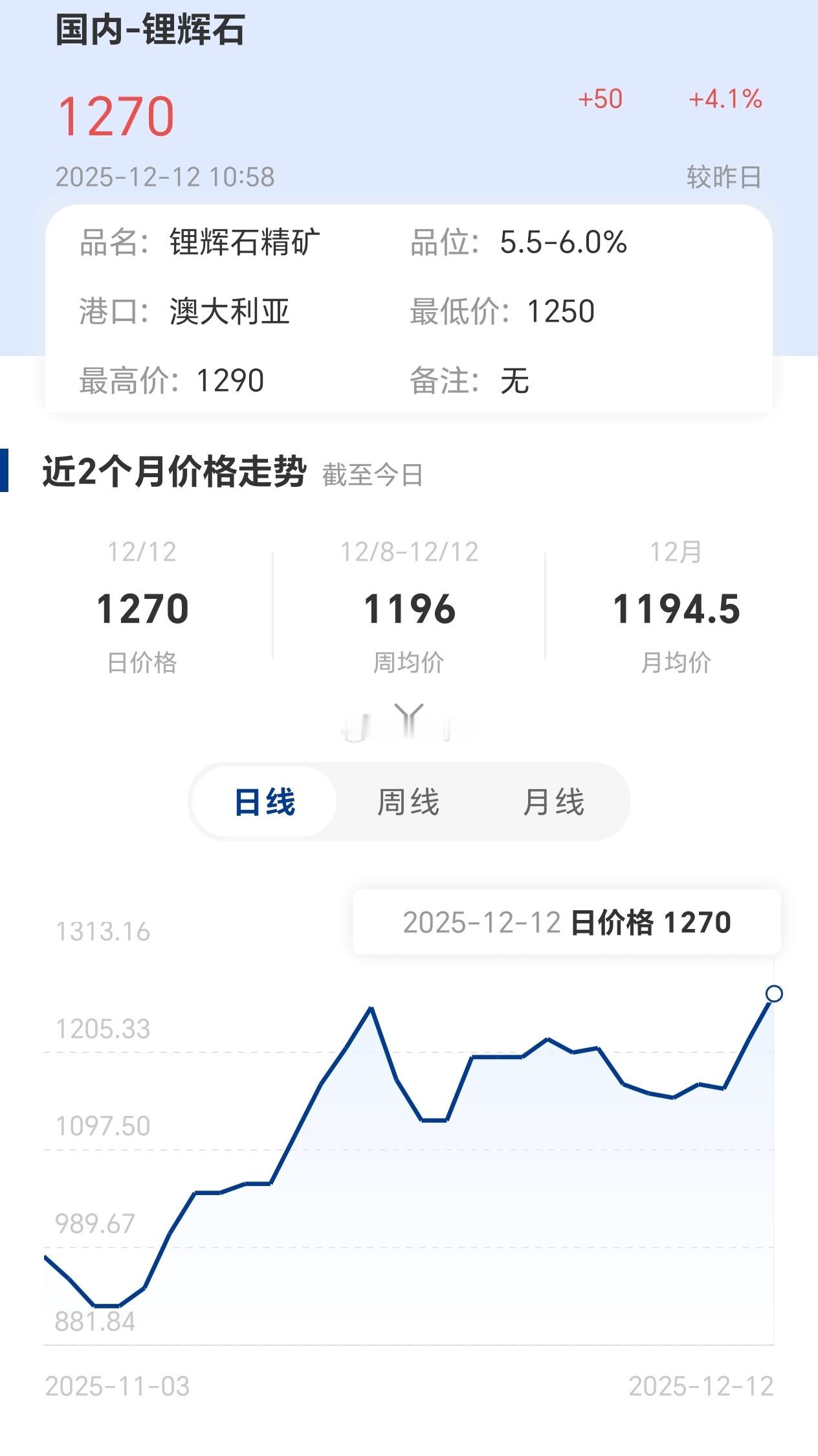 进口锂辉石价格创2024年5月以来新高12月12日国内港口澳洲锂辉石价格环比上涨50美元,报1250-1290美元/吨,中间价1270美元/吨,美元报价为2024年5月以来最高水平碳酸锂期货