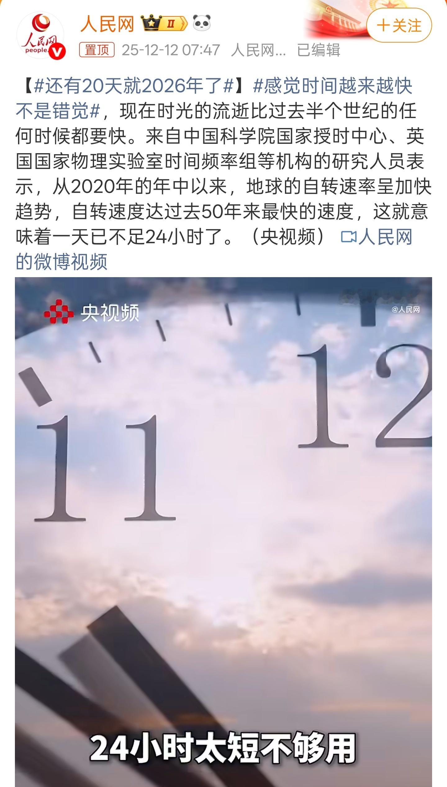 感觉时间越来越快不是错觉到底少了多少?这条微博没说,但是微博智搜有答案。2020年中以来,地球自转速率达过去50年最快水平,导致一天实际缩短约1.3-1.59毫秒。一年的话就是少了半秒左右(一秒等于1000毫秒)。所以说觉得时间过得越来越快完全是心理作用,跟地球自转没有半毛线关系。老张聊科技