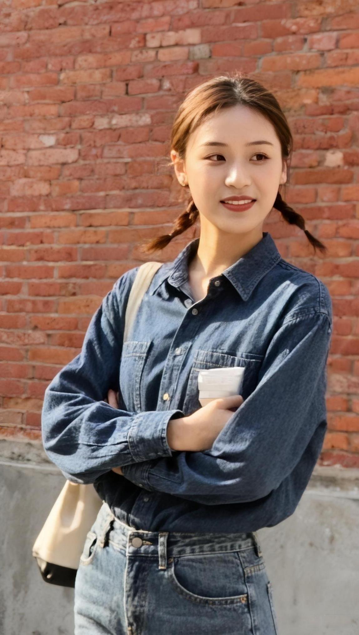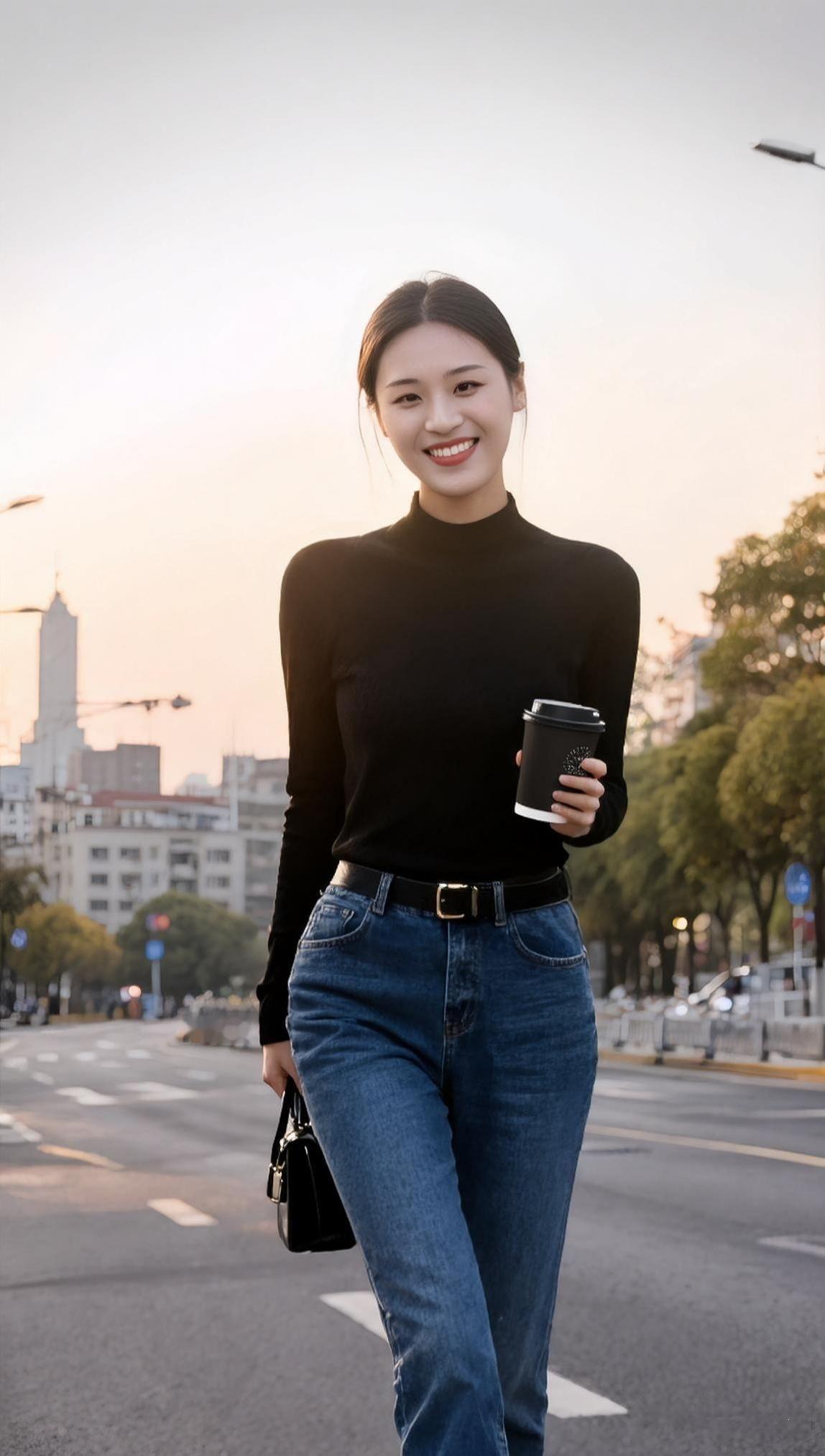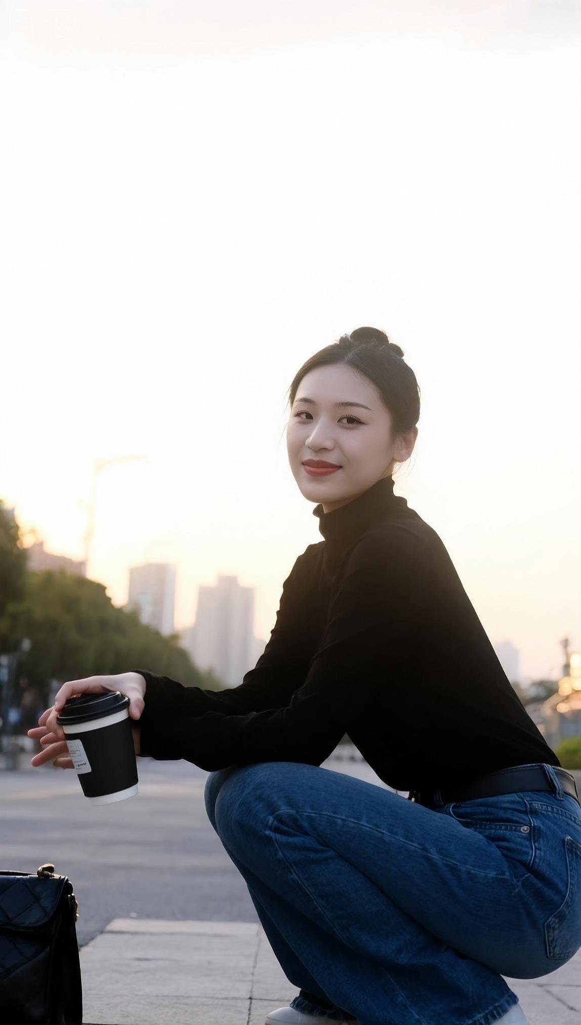 墨领裁风衬晓霞, 青衿挽步踏尘沙。 一杯轻握温寒色, 半缕残阳落鬓华。 城郭遥连烟树外, 衣衫闲惹晚风斜。 悠然坐看流云去, 漫把清欢寄盏茶。 黑色高领接住落日的余温 牛仔裤碾过街边的光斑 咖啡杯在指尖转了个圈 城市的轮廓软在暮色里 发髻挽住一缕晚风 蹲下来时 影子也跟着蜷成温柔的形状 杯沿的热气 飘向 被夕阳揉碎的天际线 初染梢头淡作金 半卷诗笺
