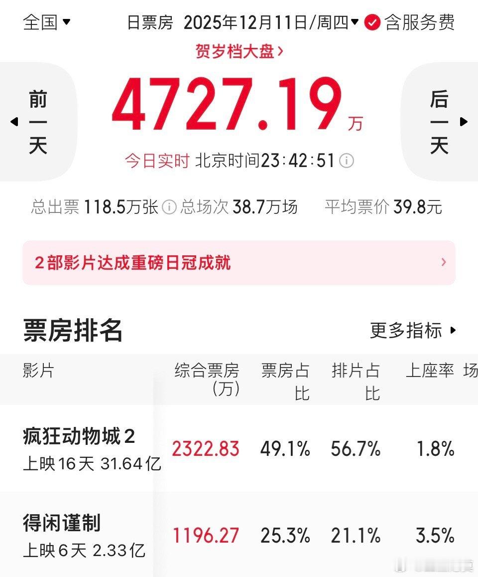 《疯狂动物城2》还是有可能冲40亿甚至超《复联4》的。《疯狂动物城2》明天大概率破32亿,本周末应该能有36亿的票房。虽然有新片(《阿凡达3》等)上映,但《疯狂动物城2》还是有自己的客源的(儿童、青少年、家庭成员)。关键是,《疯狂动物城2》密钥肯定会延期,圣诞元旦都有可能继续收割票房。所以,你觉得《疯狂动物城2》有可能破40亿甚至更多吗?
