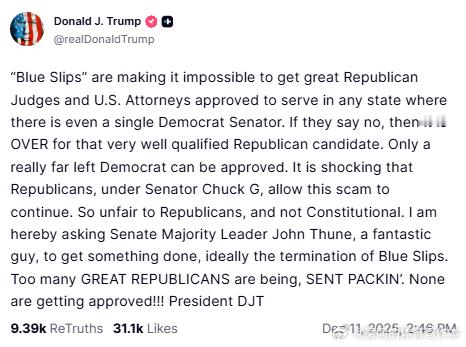 【黄金时代】川普再次呼吁终止蓝条制度川普:“蓝条”制度使得优秀的共和党法官和联邦检察官在任何有哪怕一位民主党参议员的州都无法获得批准就职。如果民主党参议员否决了他们的申请,那么这位资历深厚的共和党候选人就彻底没戏了。只有极左的民主党人才能获得批准。令人震惊的是,在参议员查克·G (格莱斯利)的领导下,共和党人竟然允许这种骗局继续下去。这对共和党人来说太不公平了,而且也不符合宪法。我在此请求参议院多数党领袖约翰·图恩(一位非常出色的人)采取行动,最好是终止“蓝条”制度。太多优秀的共和党人就这样被“送走”了。没有一个人获得批准!!!DJT总统美国和欧洲当代史川普主义研究热点现场海外新鲜事