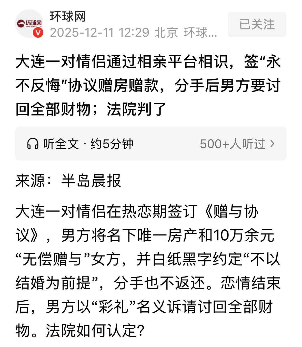 辽宁大连,男子热恋期一上头,把自己名下唯一一套房产和10万元无偿赠与女友,并签订协议,承诺以上赠与不以结婚为前提,哪怕分手了,女友也不用返还,男子原以为自己这么有诚意,俩人婚事板上钉钉了,谁料,女友拿到房子和钱后提出分手,这下房没了,钱花了,俩人还黄了,男子后悔了,直接将对方告上法庭,要求还房还钱,案子经过一审二审,最终判决让男子长了个记性。 2024年,32岁的张林通过相亲平台认识了29岁的于娟。 两人头一次见面就聊得投机,没多久就谈起恋爱。 然而,于娟在恋爱期间得知,张林其实有过婚史,但他当初在平台上隐瞒了这一点,这让于娟心里结下了疙瘩。 张林知道于娟对他有过婚史的事心存芥蒂,但他是真心想和于娟长久走下去,所以到了同年12月,为了表达诚意,他做了一个大胆的决定。 他主动提出签订《赠与协议》,说要把自己名下唯一一套70平米的房子和100001元现金赠与于娟。 张林在协议里特别注明,说本次赠与不以结婚为目的,分手后永不反悔。 随后,张林迅速把房产过户,钱也转给了于娟。 这一通操作,可把于娟感动够呛,她觉得自己找到了值得托付终身的男人,以前的事已经过去了,她也不再纠结。 在那之后,俩人的恋爱也越发甜蜜,在2025年2月14日情人节,张林又给于娟转了1314元,说要一生一世和她在一起。 之后几天,他又陆续转了三笔:9999元、9999元和1003元,寓意“长长久久”“千里挑一”。 加上平时微信里你来我往的20314元和17852元转账,以及互相送的手机、首饰等礼物,两人的经济往来越来越密。 直到2025年3月,俩人间突然爆发了矛盾,导火索就是,张林想和于娟商量买房买车的事,但两人对资金分配怎么都谈不拢。一气之下,于娟提出分手了。 张林越想越亏,房子没了,钱也花了,婚还没结成。 他跑到法院起诉,要求于娟返还房产和121001元款项,理由是这些钱和房子都是以结婚为目的的彩礼。 于娟得知后炸了,当初协议里明明说好了是无条件赠,而且他当时亲口说这是为了补偿隐瞒婚史的事,现在翻脸不认账了? 《赠与协议》里反复强调所有赠与“不以结婚为前提”,这不就是铁证? 一审法院审理时,法官发现两人交往期间确实常聊结婚的事。虽然协议里说不以结婚为目的,但结合转账记录和聊天记录,法院认为房产和100001元属于“彩礼性质”。 因为没领结婚证,法院判决于娟返还房产和80001元彩礼。 至于情人节转的21000元,法官觉得就是情侣间发红包玩,不算彩礼。 双方都不服气,提起上诉。 有人说,这次支持女方。既然双方在恋爱期间签订了协议,而协议签订又不存在胁迫和欺骗,作为成年人就应该为自己的承诺后果负责任。无论是头脑发热,还是真情表露,一言九鼎,方为君子。法律,应该为诚信撑腰。无诚无信,枉为人! 那么,从法律角度,怎么看? 《民法典》第658条规定:赠与人在赠与财产的权利转移之前可以撤销赠与。 这个案子主要得看张林与于娟签订的《赠与协议》中“不以结婚为目的”的条款是否具备效力?以及房产与100001元款项的性质认定。 协议明确排除结婚条件,且双方签字确认,符合“意思表示真实”的生效要件。 张林作为完全民事行为能力人,应预见到签字后的法律后果,所以协议中关于100001元款项的赠与合法有效,不可任意撤销。 如果赠与的房产已经办理过户登记,权利转移完成,那么赠与人原则上丧失撤销权。 但是法院认为房产隐含“婚后共同生活”的潜在目的,属于大额资产且涉及基本生存权,因此突破一般赠与规则,比照彩礼处理。 至于那100001元的款项,协议明确排除结婚条件,且无证据表明存在欺诈、胁迫或违反公序良俗,所以不适用彩礼返还规则。 那咱们来看看二审法院怎么判的。 于娟二审时拿出新证据,那就是张林之前确实隐瞒过离婚史,赠与时他亲口说过“想好好补偿你”。 于娟的律师还强调,张林作为成年人,签协议时应该清楚法律后果,现在反悔违背诚信原则。 中院重新审理后,对款项和房产做了区分。关于那100001元,法院认为协议明确排除了结婚条件,男方签字时是自愿的,不能出尔反尔。 但房产不同,这毕竟是大额资产,通常都是为了婚后共同生活。 虽然协议也写了“不以结婚为前提”,但考虑到张林是普通工薪族,这房子是他唯一的住处,分手后返还更公平。 至于其他转账,二审维持原判,认定是恋爱期间的情感互动,不算彩礼。 最终,二审改判于娟只需返还房产,不用还那10万多块钱。 又有人看后表态,说其实房产也不应退还,毕竟签订有正式的合约,都是正常的成年人,应知道轻重,应该为自己的行为负责,承担责任和后果。法院判决退还房产,明显违背了合同法,也是对诚实信用原则的蔑视。 对此,你怎么看? 关注@运良说法. 学法律知识不迷路