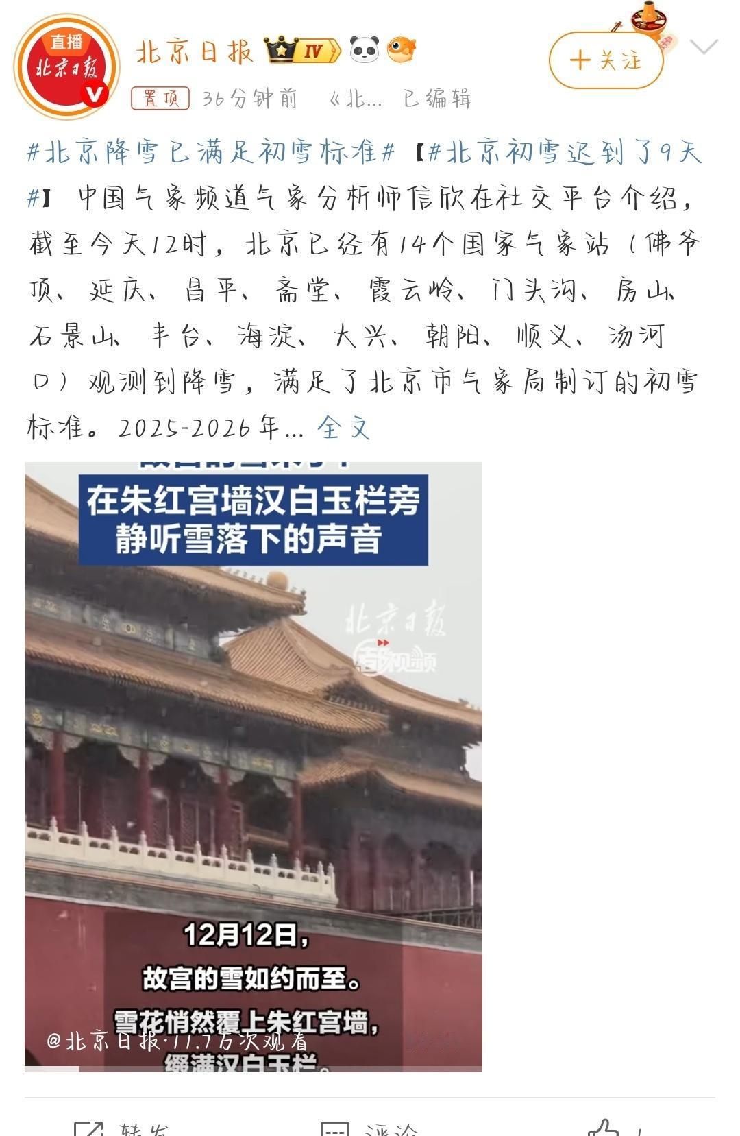北京降雪已满足初雪标准 北京今冬初雪今日中午正式“官宣”。截至12时,全市14个国家站观测到降雪,达标入冬首场雪标准。本次降雪较常年迟到9天。从凌晨开始,雪自西部山区向城区扩展,城区中午前后趋于明显,预计持续至前半夜。全市普降中雪,积雪蓬松,山区局地可达暴雪级别。
