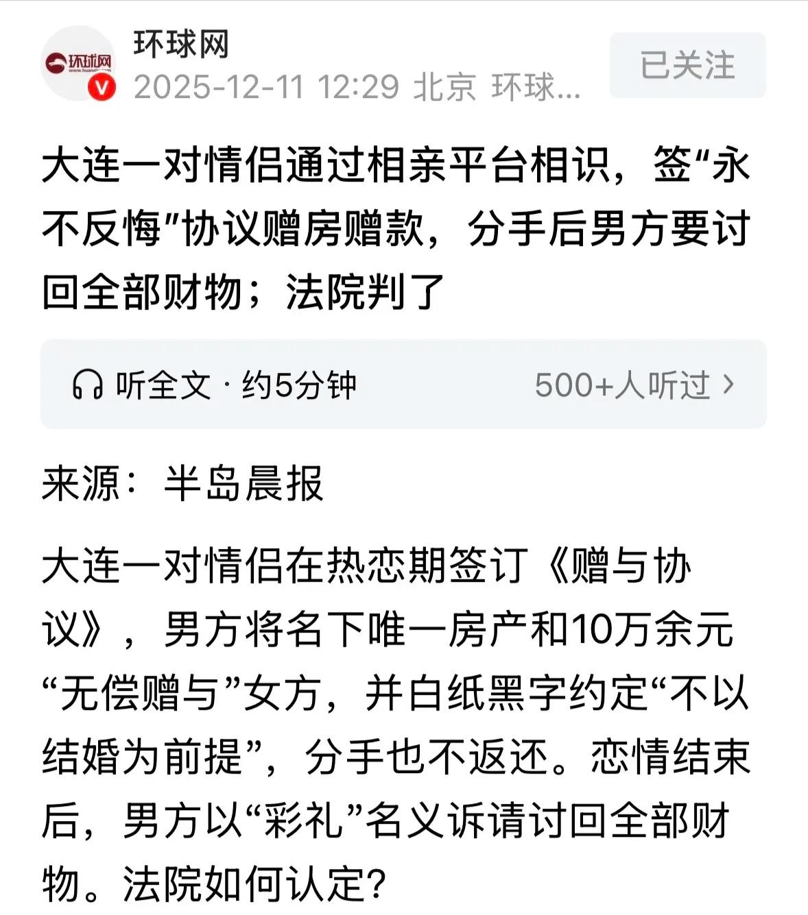 大连男子热恋上头,赠房赠10万还签“分手不返还”协议,女友提分后他悔了,法院判决太现实! 大连32岁男子张林,相亲认识女友后,为表诚意直接豪掷千金,把自己名下唯一一套70平房产+10万现金无偿赠与对方,还特意签了《赠与协议》,白纸黑字写清“不以结婚为前提,就算分手也绝不反悔要回”。本以为诚意拉满能抱得美人归,没成想领证前闹掰,女友提了分手,房没了钱没了爱情也黄了,张林越想越亏,直接把女友告上法庭要回所有东西,历经一审二审,最终判决让不少人议论纷纷! 事情得从2024年说起,32岁的张林通过相亲平台认识29岁的于娟,俩人第一次见面就聊得特别投缘,很快就确定了恋爱关系。可相处没多久,于娟就发现张林隐瞒了婚史,当初相亲时压根没提过,这让她心里特别膈应,对这段感情也没了安全感。 张林知道自己错了,又真心想和于娟好好走下去,怕因为这事黄了婚事,思来想去,决定用实际行动表诚意。同年12月,他主动找于娟签了《赠与协议》,明确表示要把自己名下唯一一套70平米的房子,还有100001元现金无偿赠与她,协议里还特意标注“本次赠与不以结婚为目的,分手后永不反悔,不要求返还”。 签完协议,张林立马兑现承诺,当天就办好了房产过户手续,把房子转到于娟名下,100001元也直接转了过去。于娟被这份诚意打动,慢慢放下了婚史的芥蒂,俩人感情越来越甜。2025年情人节,张林又转了1314元红包,之后几天陆续转了9999元、9999元、1003元,寓意“一生一世”“长长久久”“千里挑一”,平时还会互送手机、首饰,俩人为结婚的事也聊了不少,看着好事将近。 可没等俩人领证,矛盾就来了。2025年3月,张林跟于娟商量买房买车的事,没想到俩人在资金分配上吵得不可开交,怎么谈都谈不拢,一气之下,于娟直接提出了分手。这下张林彻底懵了,房子没了,10多万也花出去了,婚没结成,自己落得一场空,越想越觉得亏得慌,转头就把于娟告上了法院,要求她返还房产和121001元,理由是这些都是以结婚为目的的彩礼,没领证就该退。 于娟得知后又气又委屈,直言当初协议写得明明白白,是无条件赠与,跟结婚没关系,而且张林赠东西时,也说过是补偿隐瞒婚史的过错,现在分手了就翻脸不认账,太没诚信,坚决不同意返还。 一审法院审理时,发现俩人确实常聊结婚的事,虽然协议写了不以结婚为目的,但结合转账和聊天记录,认定房产和100001元属于彩礼性质,没领证就该退,最终判决于娟返还房产和80001元,至于那些小额红包,算情侣间的情感互动,不用还。可俩人都不服,双双提起上诉。 二审时,于娟拿出新证据,证明张林确实隐瞒婚史,赠房赠钱是为了补偿,律师也强调,张林是成年人,签协议时清楚法律后果,现在反悔违背诚信原则。中院重新审理后,做出了改判:100001元不用还,因为协议明确排除结婚条件,是双方真实意愿,签字就有效,不能出尔反尔;但房产得还,毕竟是大额资产,还是张林唯一的住处,关系到基本生存权,结合俩人聊结婚的情况,返还更公平;小额红包依旧不算彩礼,不用还。 最终判决下来,张林只追回了房子,10万多元打了水漂,这事也引来了不少争议。有人说张林活该,成年人要为自己的冲动买单,签了协议就该认,反悔没诚信;也有人觉得法院判得对,房产是刚需,不能因为一时冲动就让人无家可归,公平比单纯按协议来更重要。 其实这事也给所有人提了醒,恋爱时千万别头脑一热就大额赠财物,尤其是房子、大笔现金这种重要资产,哪怕再爱,也得保持理性。签任何协议前都要仔细看条款,清楚自己要承担的后果,别图一时痛快,后续追悔莫及。还有情侣间的大额往来,最好明确用途,是赠与、借贷还是彩礼,避免分手后说不清楚,闹到对簿公堂的地步。 大家觉得二审法院判得合理吗?你觉得房产该不该返还?要是你谈恋爱,会接受对方这么贵重的赠与吗?遇到这种情况,你会怎么处理?欢迎在评论区聊聊你的看法,也把这些提醒转给身边谈恋爱的朋友,别让真心错付还亏了钱财!