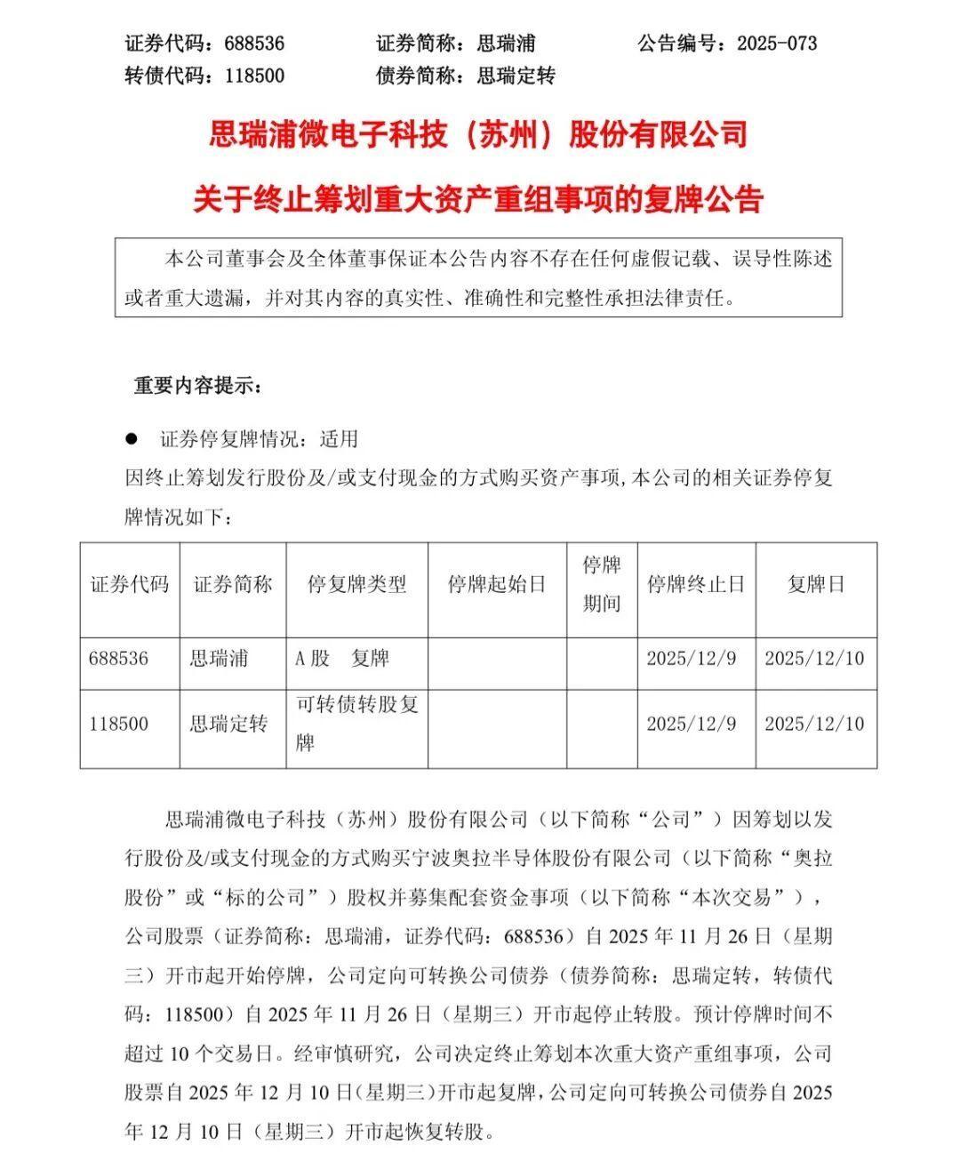 重大资产重组,终止!明起复牌 12月9日晚,思瑞浦发布公告称,决定终止筹划通过发行股份或支付现金的方式收购宁波奥拉半导体股份有限公司(奥拉股份)的股权,并取消配套资金的募集。这一决定是经过公司与各方磋商后作出的,认为目前实施该重大资产重组的条件尚不成熟。思瑞浦强调,终止这一重组不会影响公司的业务和财务状况,也不会对股东,尤其是中小股东利益产生不利影响。 事实上,早在11月25日,思瑞浦就与多个投资方签署了股权收购意向协议,拟进行此次交易。但由于该交易仍在筹划阶段,且未签署正式协议,因此不涉及违约责任。公司表示,未来将继续致力于其既定战略目标,探索与奥拉股份的业务合作机会。 思瑞浦还披露了最新财务表现。25年前三季度,公司实现了15.31亿元的营业收入,同比增长超过80%,并实现了1.26亿元的净利润,同比大幅扭亏。公司表示,将继续在信号链与电源管理领域加大研发投入,并推动新产品的量产,以巩固在光模块、汽车、服务器等重点领域的市场地位。