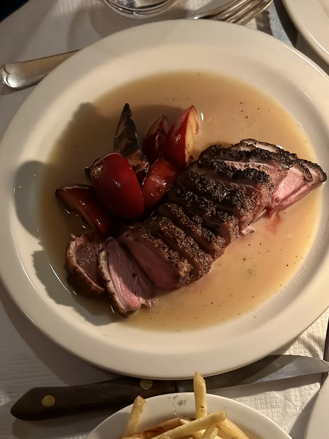 - 鸭胸肉忒好吃了吧!!表皮微焦略咸+粉嫩肉感。烤李子微酸,很解腻。我不爱吃鸭子,但这道是真好吃啊!