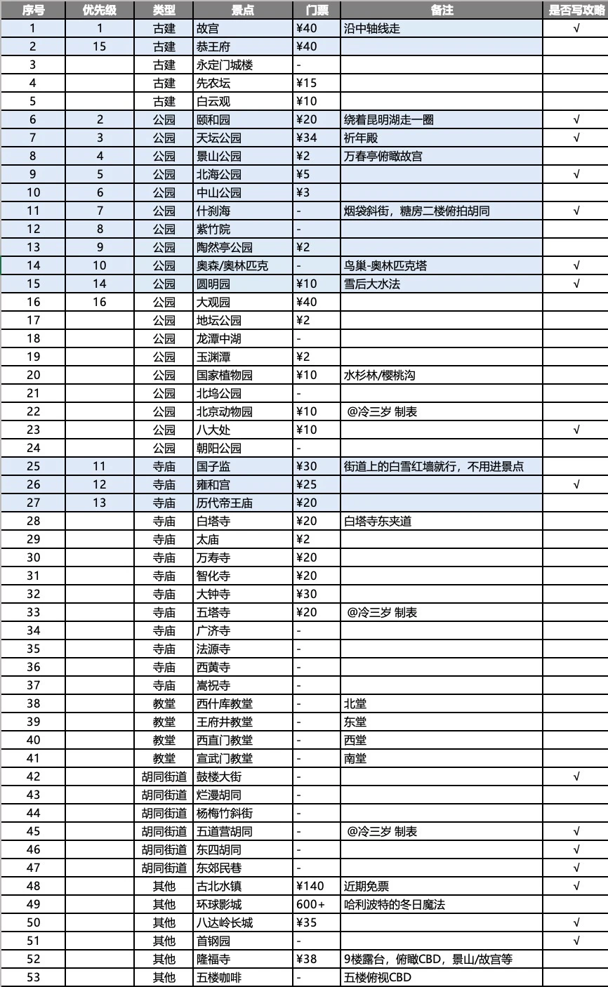 今年10-11月,北京赏秋 我走了差不多40个地方 明天应该就迎来了北京的初雪 我在北京工作生活了10年 [笑哭R][笑哭R]其实也没好好欣赏帝都的雪景 所以我也先简单整理了 北京下雪了适合去的地方 初步看大概有50个地方左右 今年希望12~1月,北京的雪多下一些 我能够至少走完一半吧 [向右R]图1,是北京看雪地图分布 [向右R]图2,是北京赏雪名单 根据我初浅的了解,先简单排了个序 我会大概按这个优先级走完 (每当下雪,雪还没化的时候) 够我自己用这两个月了 期间,我应该还会补充,修正 再分享出来 并配上现场拍的新图吧 整体来说,北京赏雪,去的地方优先考虑以下特征 [向右R]1.古建,红墙,楼阁等 故宫、天坛、国子监、雍和宫等这些比较适合(寺庙等) [向右R]2.有山、有水/湖、桥、楼阁等,视野开阔更好 颐和园、北海、中山公园、什刹海、紫竹院、陶然亭等 [向右R]3.能够俯视 景山公园、隆福寺9层等(这类机位,我还没太找到) 包括俯视拍一些胡同,巷子,屋顶等 [向右R]4.山里的 八达岭等,这类地方,下雪比较多,不急,可以等1月去看冰瀑时一起。 [集美R][集美R]对了,有不少寺庙是免费的,也有些是限时周三前200免费 如图3 以及之前做的北京寺庙分布图,图4 不过不全,最近我还会完善刷新下 [集美R][集美R][集美R]另外,我之前也去过一些地方了,也画了地图攻略路线 也顺带一起发出来吧,图6~18 [飞吻R][飞吻R]大家有啥赏雪的好去处,求补充吖。 PS.桦皮岭,乌兰布统的雪,还想啥时候去看看呢 不知道周五周六雪有多大 [笑哭R][笑哭R]反正我前天先把这两天故宫的票都约了 (图5,比1个月前好约太多了,看国博也有票了,真的是冬天淡季来了)