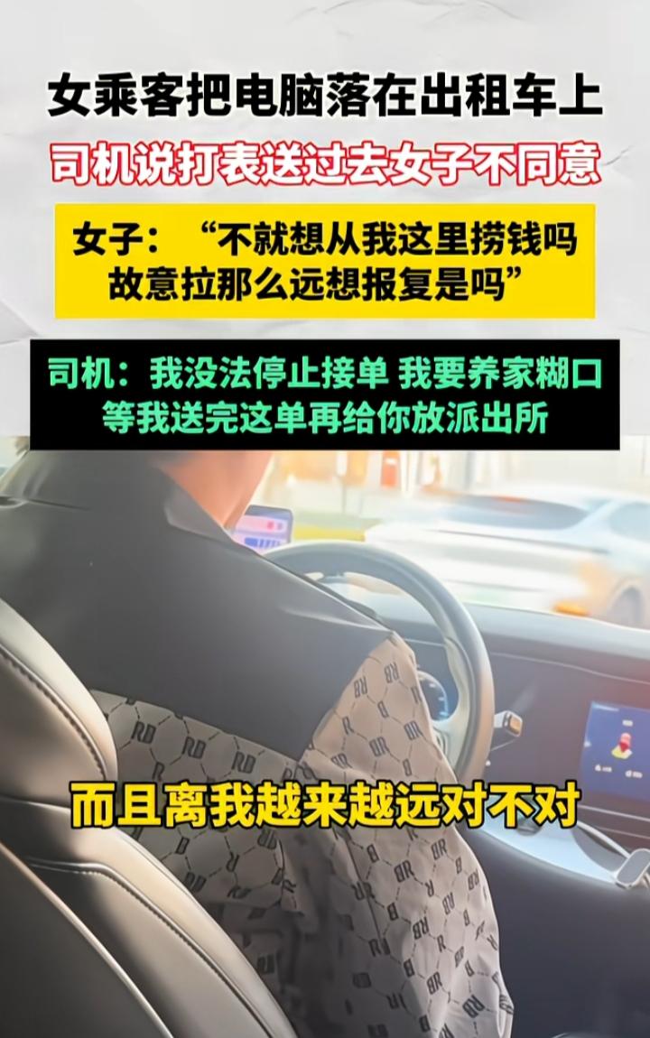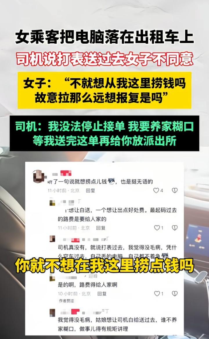 “你不就想从我这捞点钱吗?”女子将电脑落在出租车上,要求司机送回,司机说打表给送过去,女子竟开口这么说 “你不就想从我这捞点钱吗,车开那么远故意报复我是吧?” 司机也很无奈:“我没办法停止接单,我要养家糊口,等我送完这单给你放到派出所。” 无语了,她是有被害妄想症吗,看谁都是坏人,她意思她把电脑落下了,让司机免费无偿给她送过去呗!人家答应把你丢的东西送过来,最起码应该表示感谢吧,不想出路费自己过去拿也行啊,上来就指责,也真好意思啊,一点我不知道感恩,不想想人家也在忙,要上班赚钱,打表给送过去这是最简单的办法了吧?出个路费就行。还故意跑那么远,报复,出租车一会跑遍整个城市都正常的 碰到这样的,本来想给她送的都得放弃,气人呀 图片及素材源自网络