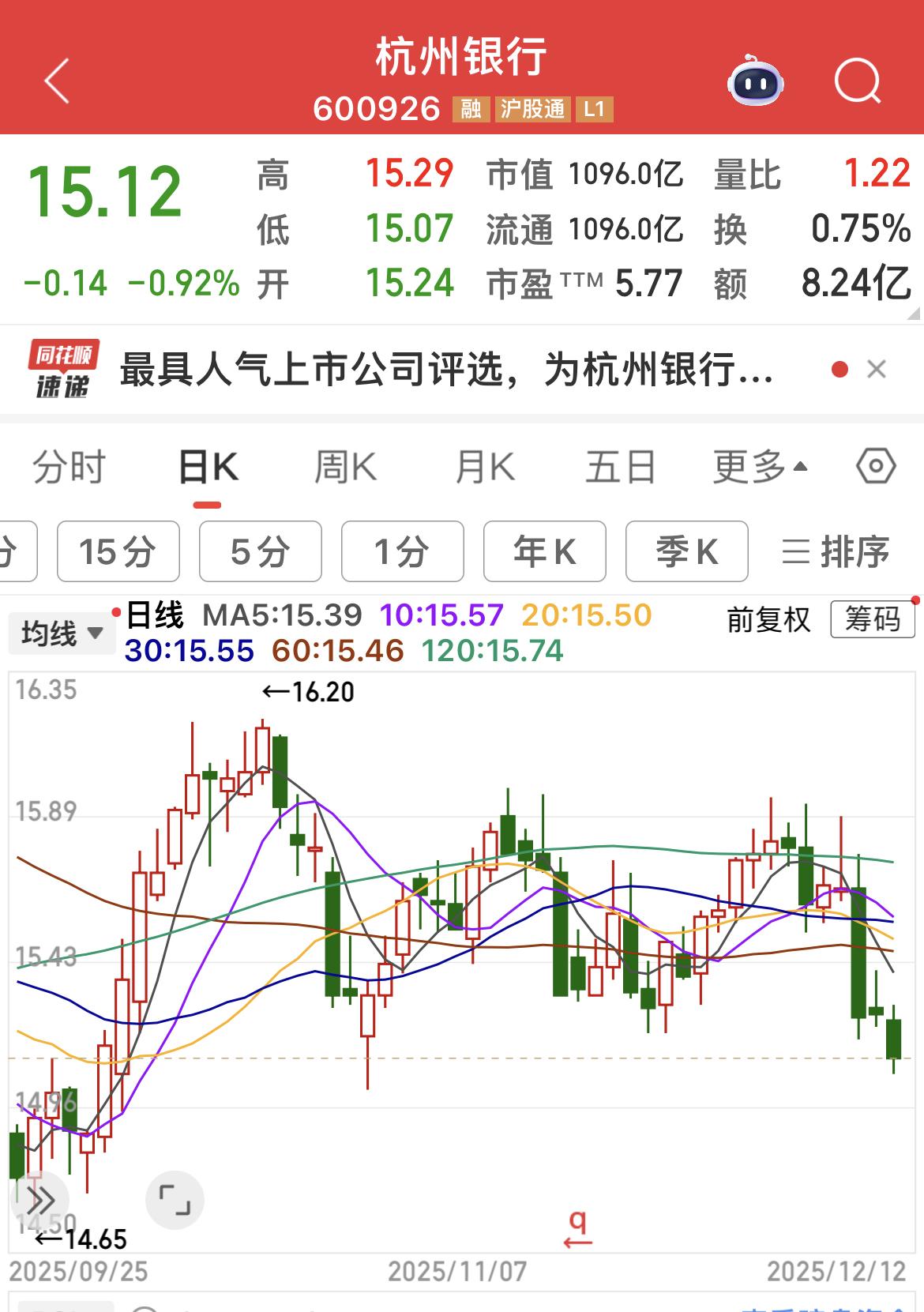记得前几个月,有位股友听信某大V的言论,杭银成长性行业第一,于是在历史最高价附近重仓买入,还动用了融资。 我劝过他:好企业+好价格=好投资,当时杭银远离5年均线40%多(超买了),况且当时股息率很低。 不听老人言,吃亏在眼前!