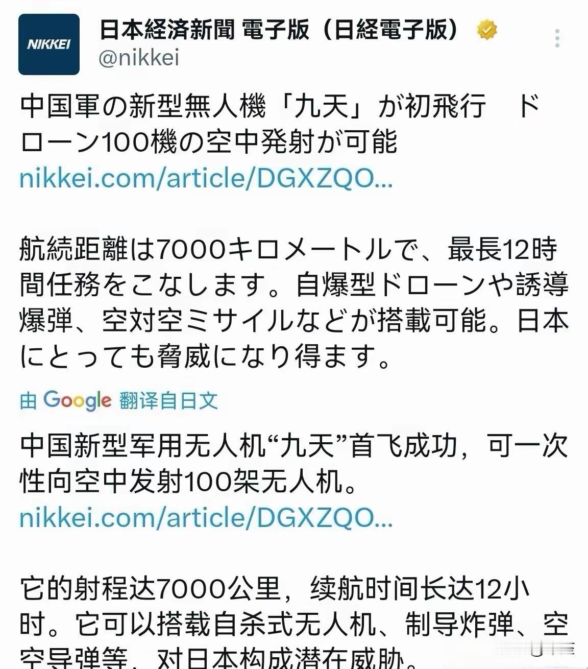 “九天”无人机为何让日本破防? 日本媒体发文报道了我们的“九天”无人机试飞成功的新闻:“中国新型军用无人机‘九天’首飞成功,可一次性向空中发射100架无人机。它的射程达7000公里,续航时间长达12小时。它可以搭载自杀式无人机、制导炸弹、空空导弹等,对日本构成潜在危险。” 日本媒体罕见大篇幅炒作中国"九天"无人机,字里行间的焦虑绝非刻意渲染,而是实打实的战略恐惧。 首先怕的是防空体系被瞬间击穿。日本凭借密集部署的爱国者导弹、宙斯盾系统构建了“密不透风”的防空网,但这套系统针对传统战机、导弹设计,面对“九天”的“蜂群战术”完全束手无策。1架“九天”可搭载数十架小型无人机,形成饱和式攻击,而日本单套防空系统一次只能拦截少数目标,面对多方向、多批次的无人机蜂群,要么顾此失彼,要么因拦截成本过高,一枚导弹价值数百万美元,而小型无人机仅数万美元打不起。7000公里的射程更让日本引以为傲的本土防御圈形同虚设,从中国近海起飞即可覆盖日本全境,彻底打破了御敌于国门之外的幻想。 其次怕的是关键目标暴露无遗。日本的军事基地、港口、核电站等核心设施高度集中,且多位于沿海地区,几乎没有战略纵深。“九天”不仅能搭载攻击型载荷,更具备强大的侦察监视能力,12小时的超长续航可对日本全境进行不间断巡逻,精准锁定各类关键目标的位置、部署情况。一旦冲突爆发,“九天”可先通过侦察无人机摸清防御部署,再释放自杀式无人机摧毁雷达、通信枢纽等节点,为后续打击打开通道。这种“发现即摧毁”的能力,让日本的核心设施彻底失去隐蔽性,沦为活靶子。 更深层的恐惧是战略不对称差距无法弥补。日本在无人机领域起步晚、短板多,自研的攻击型无人机尚处于试验阶段,依赖进口的MQ-9B、TB-2等无人机,无论是航程、载荷还是蜂群协同能力,都远不及“九天”。而中国在无人机领域已形成完整的产业链和作战体系,“九天”并非孤军奋战,而是可以与其他无人机、导弹、有人战机形成协同作战,形成多层次、全方位的威慑。日本清楚地知道,自己短期内无法研制出对等装备,只能眼睁睁看着这种不对称差距不断扩大,原本依赖美国的“核保护伞”和自身的防御体系,在“九天”这类新型装备面前越来越脆弱。 日本的恐惧,是对中国国防科技进步的本能反应,更是对自身战略短板的清醒认知。“九天”无人机的研发,是中国维护国家主权和领土完整的正当举措,从未针对特定国家。但如果某些国家执意将中国视为威胁,不断突破战后体制、强化军事扩张,那么当中国的防御性装备具备足够威慑力时,它们感受到的恐惧,不过是自食其果。