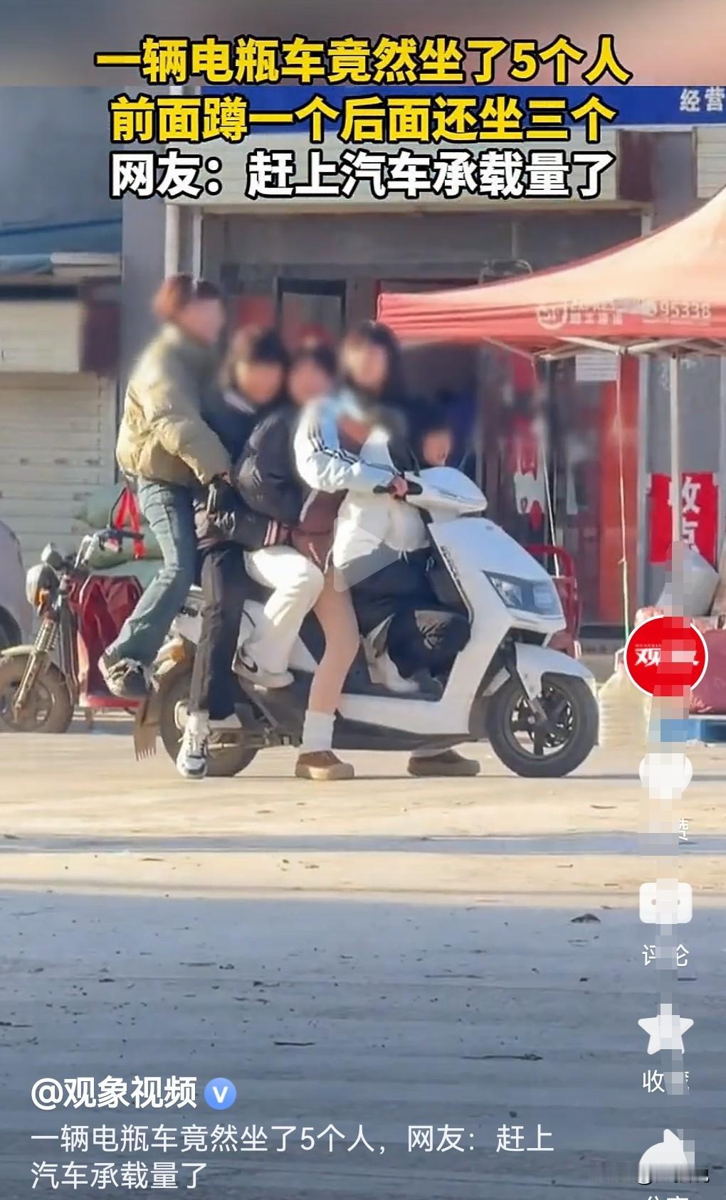 这真是太乱来了。 有些小年轻就是无知无畏。 从来不把交通法规放在眼里。 一辆电动车竟然坐了5个人。 真的是严重超载。 而且还不带头盔。 是要好好的教育惩罚一下了。