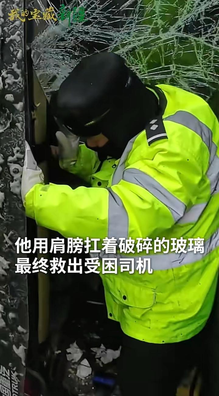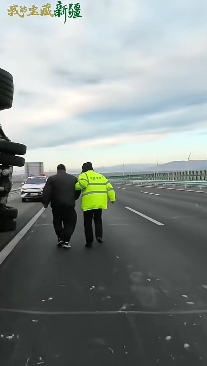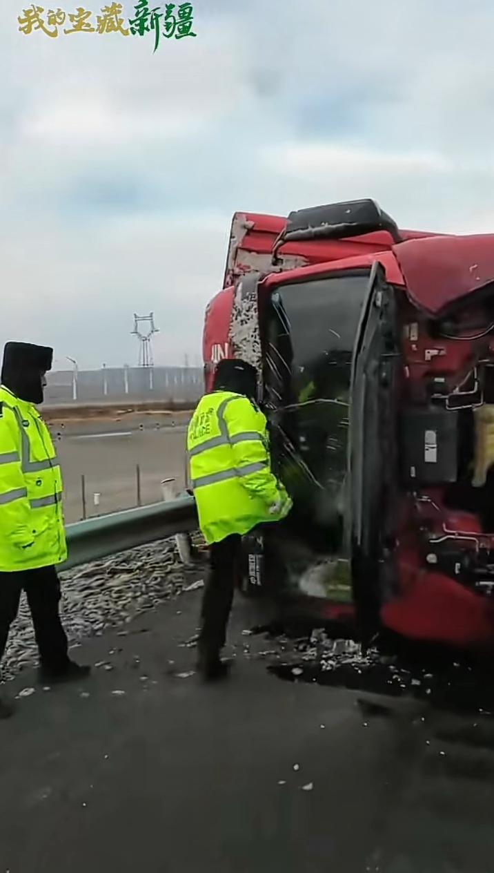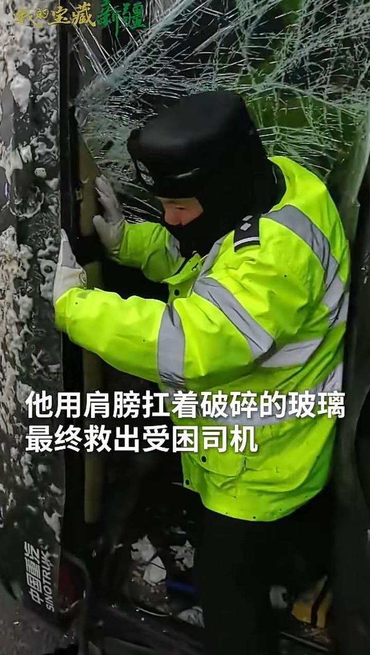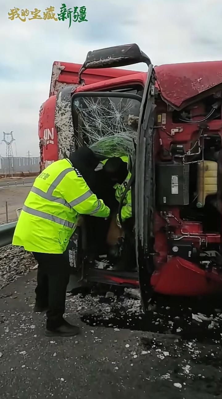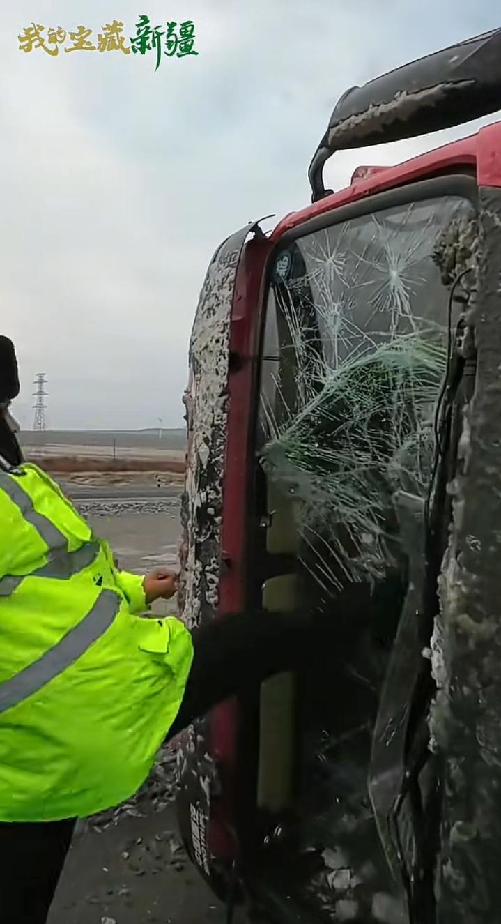 12月11日新疆托克逊县连霍高速G30路段,10级大风将一辆返程的空卡车吹翻,交警接警后迅速救援可到了地方后犯了大难。 车门一边变形一边被压住,他们随身未带任何尖锐工具,在戈壁滩找了一会就弄到一块巴掌大的石头,面对呼啸而过的北风,那寒意吹的人瞬间清醒,卡车里那双渴望被救出的眼神,让前来的交警决定暴力破窗,他们二人接连上阵,你一脚我一脚可那挡风玻璃平时看着很容易碎,可让它碎的时候似乎非常顽强,可这难不倒前来的救援人员,他们朝一个地方连续暴击,终于裂开了一些纹路。 此时的他们看到希望就在眼前,于是决定做最后的冲刺,他们又担心玻璃碎片会无意间伤到谁,于是说既然下面的玻璃已经脱离,不如用背部做为扛杆撑开一个口子即可,不必非的把玻璃完全打碎,那名高个子交警说:我来我身材高大有劲,另一名交警说:这不是个大小的问题,你身高和玻璃一样长反而不好使力,我有点胖个头不高刚好可以占据有利位置,等我撑起玻璃时你负责接应司机出来,听他这么说貌似也有几分道理,于是二人配合将卡车司机顺利救援出来,有点微胖吓坏了。 随后顶着大风一路小跑着上了另一辆汽车,看他灵活的姿势应该没有受伤,新疆的交警真的棒棒哒,另外托克逊拌面很久没吃了,如果有空真想去大美新疆,尝尝那库尔勒的香梨,哈密的瓜,吐鲁番的葡萄人人夸,如果是囊饼裹上羊肉串那真的是人间美味,告诉你们一个小秘密,在新疆每个县都有特别的一样特色,比方说沙湾大盘鸡.巴楚县巴楚菇.和田玉枣.伊犁马.喀什的石榴.库车的小白杏.当然还有干果之王巴旦木,也是唯一能和夏威夷果.咖啡豆.巧克力豆齐名的国产干果,绝对是您走亲访友.泡妞撩妹的最佳礼物。