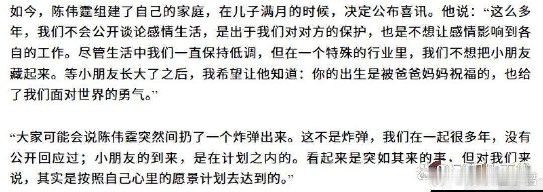 陈伟霆首谈官宣生子原因近日,陈伟霆受访透露和何穗在一起很多年,不公开谈论感情生活,是出于互相的保护以及不想影响到各自的工作。小朋友的到来是计划内的,他们不想把小朋友藏起来,他们希望小朋友知道:“你的出生是被爸爸妈妈祝福的,也给了我们面对世界的勇气。