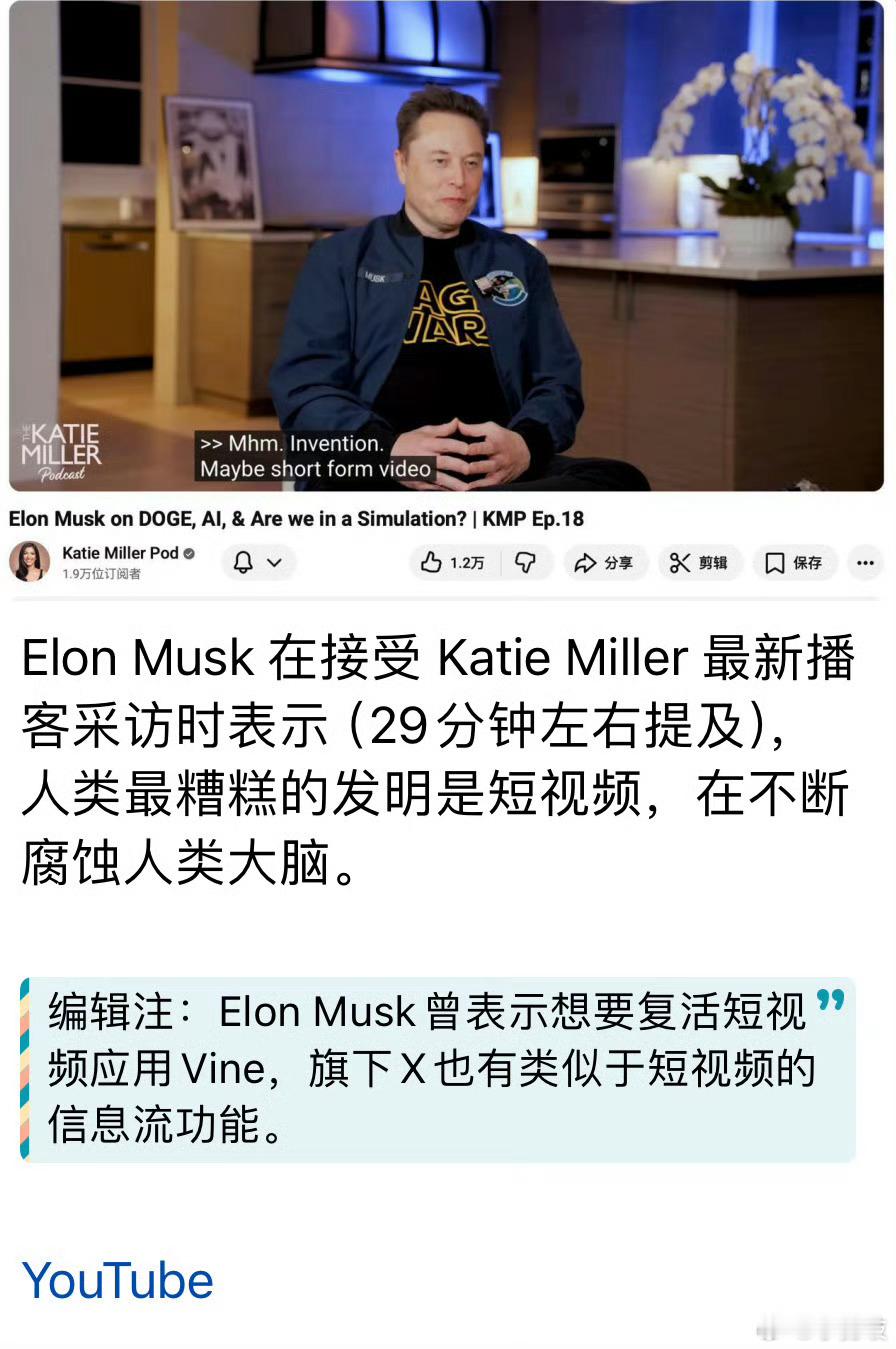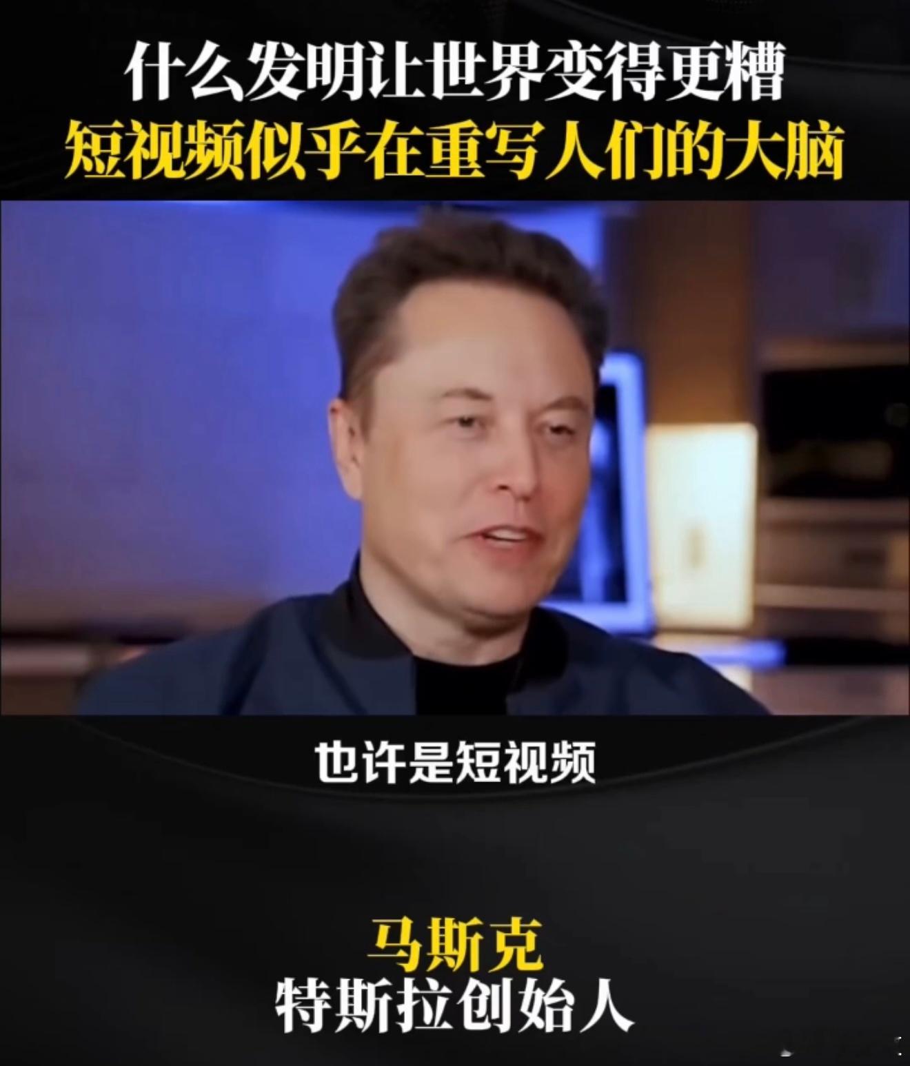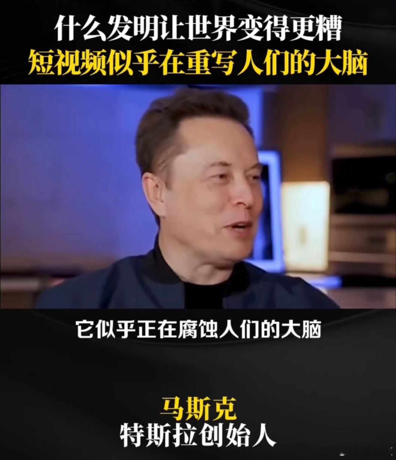 马斯克批评短视频文化:称其“越看越降智”!马斯克吐槽短视频在近期一场深度访谈中,主持人向特斯拉CEO埃隆•马斯克提出了一个引人深思的问题:"什么发明实际上让人类社会变得更糟糕而非更美好?"面对这一颇具挑战性的问题,马斯克几乎没有丝毫犹豫,给出了一个直截了当的回答:"我认为很可能是短视频。这种内容形式让人越看越变得愚钝,最终会摧毁所有人的思维能力。"他进一步表达了自己的担忧,希望未来不会出现那些能够损害人类智力的发明被创造出来。马斯克称短视频腐蚀大脑值得注意的是,在这次访谈过程中,马斯克还深入探讨了人类存在的本质意义。他坚定地表示,科技发展的终极目标不应是取代人类,而是拓展人类意识的边界和可能性。在他看来,人类文明之所以能够持续发展并不断进步,关键在于始终坚持三个核心价值观:对真理的追求、对美的欣赏以及永不停息的好奇心。这一观点展现了他对科技与人文关系的深刻思考,以及对人类未来的积极展望。