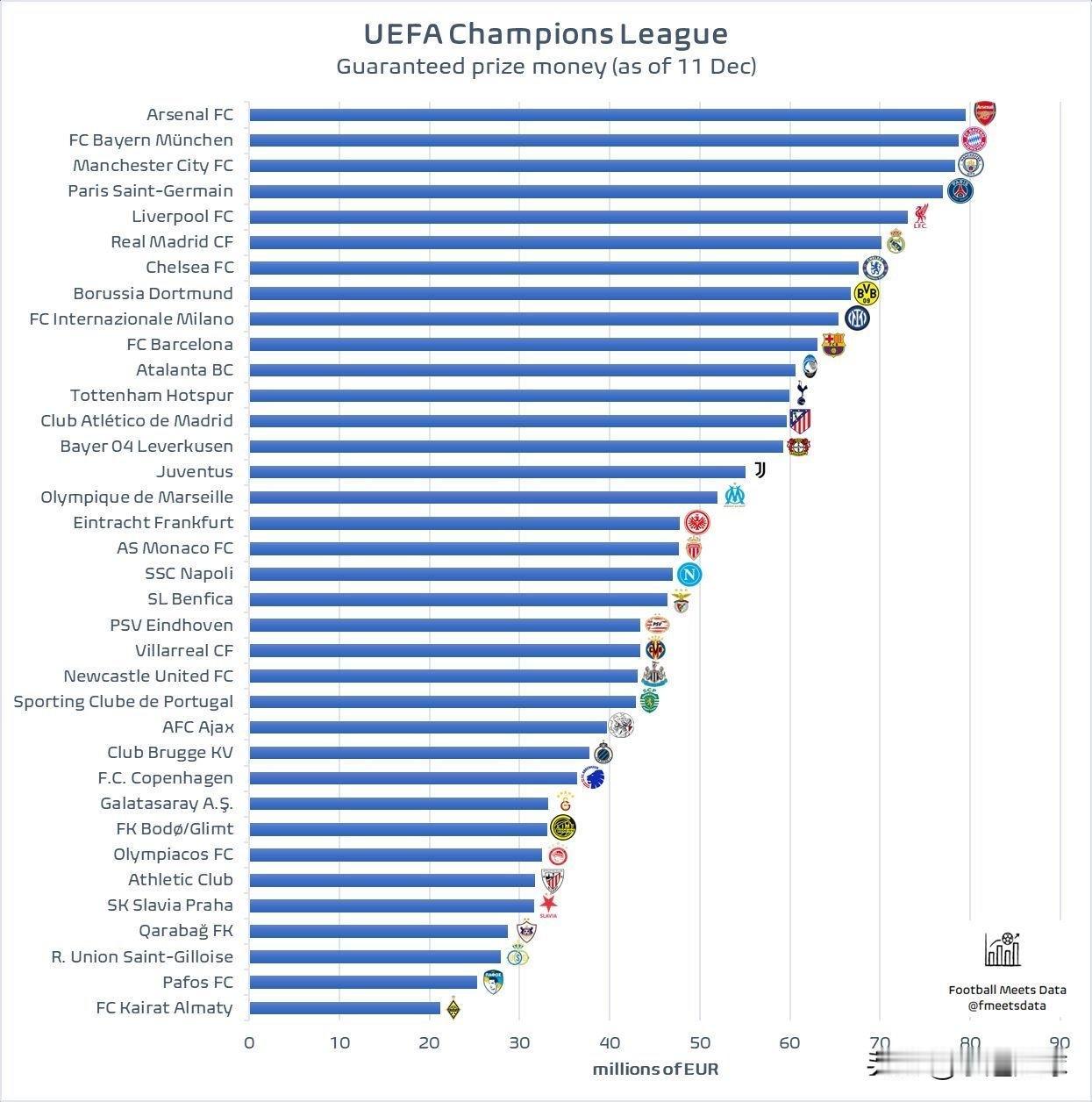 [欧冠小组赛第6轮后奖金排名] ▪️阿森纳以7950万欧元保障收入攀升至榜首! ▪️皇家马德里突破7000万欧元门槛 ▪️巴塞罗那、亚特兰大本周奖金均超6000万欧元 ▪️马赛奖金突破5000万欧元 本赛季欧冠总奖金达24.7亿欧元(约合人民币195亿元),较上赛季增加约3300万欧元。