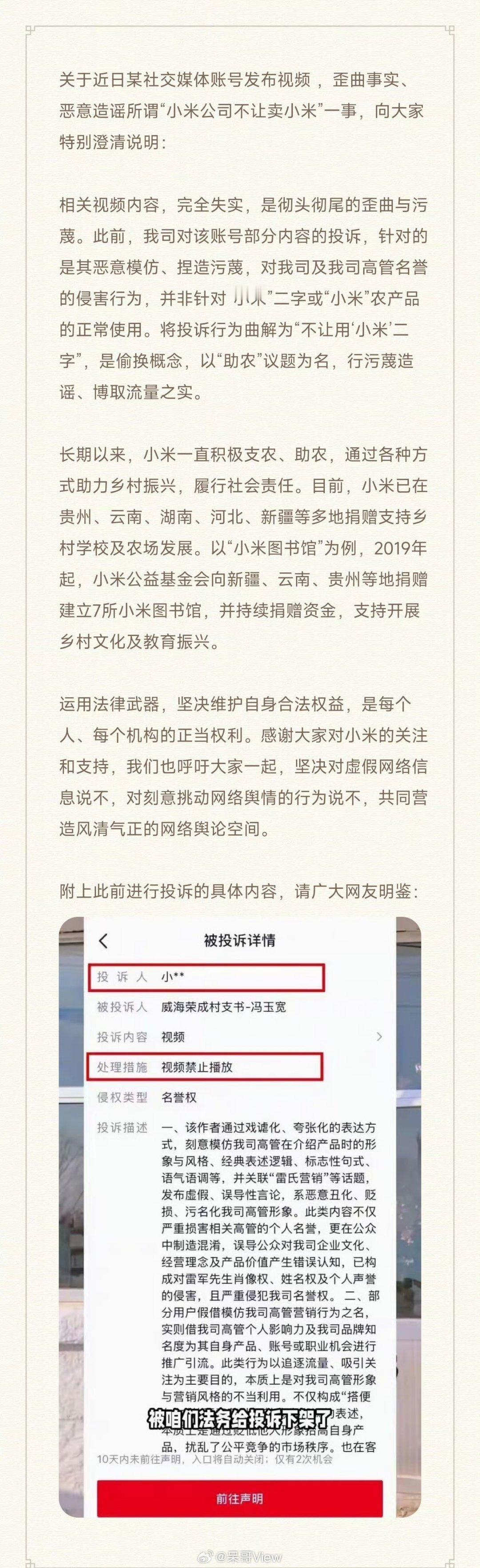 小米公司官方辟谣,是村支书将正当投诉行为偷换概念、恶意曲解为不让用“小米”,并大肆传播博取流量。而且你们信不信,村支书恶意营销,小米法务部出手后,他们还可能不要脸的再发一条视频诚恳道歉,再接一波流量。