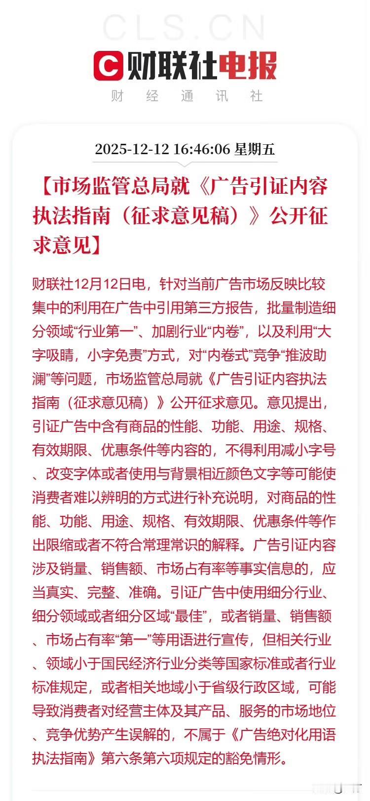 新规定来了:广告不得利用减小字号等进行补充说明[捂脸] 很多人对小字免责感到很困扰,可能今后这个事情会慢慢地退出市场,成为一个历史事件, 因为就在刚才,市场监督管理总局的一份广告引征内容执法指南,开始公开征求大家的意见了。 这个征求意见稿,比较明确的写出来,今后不能够用大字吸睛,小字免责的方式进行产品方面的宣传了。 不过现在还在征求意见的阶段,不知道什么时候能够形成真正正式的规定,如果到时候这个规定实施起来之后,估计很多宣传自己产品的企业,会按照这个规定来做相应的工作。 至少不能像现在这样,让我们在各个公开场合都能够看到,硕大的广告下面,有一些密密麻麻的难以看见的小字。 这种事情,至少从行业规定上不允许了,不知道这样弄之后,能不能够让一些企业在做这方面的PPT的时候,更加的规范一些。 毕竟消费者,还是希望能够看到实事求是的描述,这样大家才能够好好的安心的消费,也希望企业能够比较客观的描述自己的产品,给大家营造一个比较好的消费环境。 当然,一个新的规定出来之后,一定会有一段时间的适应期,不管是市场还是企业或者是消费者对这个事情,都会有一个慢慢地改变和接受的过程,只希望开始的时候,就能够把这个事情,按照相应的规定严格执行,不要让他们再想出什么新的办法出来了[捂脸]