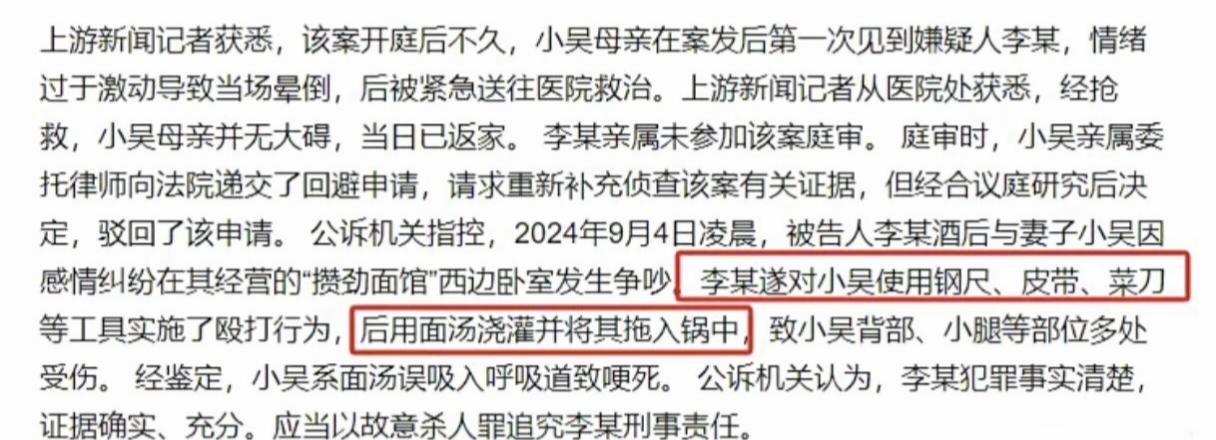 近日,备受关注的陕西男子李某春故意杀人一案迎来一审判决,李某春因犯故意杀人罪被判处死刑,缓期二年执行。 经法院审理查明,2024年9月4日凌晨,李某春酒后因感情纠纷与妻子吴某莉发生争执。争执过程中,李某春持钢尺、皮带、菜刀等工具对吴某莉实施殴打,随后又拖拽受伤的吴某莉至锅边,强行灌浇面汤,最终致吴某莉因机械性窒息死亡。 据悉,李某春与吴某莉结婚二十余年,二人曾共同辗转多地务工,后经营一家面馆,育有一儿一女。2025年2月,该案一审开庭审理,庭审中李某春辩称其醉酒后并非故意杀人,仅是意图“吓唬”妻子,未料及严重后果。吴某莉父母当庭提出判处李某春死刑立即执行的诉求,案件当时未当庭宣判。 历经三次延期,法院于2025年12月12日作出一审判决。法院审理认为,李某春存在自首情节,且案发后取得了被害人亲属的谅解。同时查明,2024年6月以来,吴某莉因网络不当交友行为引发双方感情矛盾,对本案发生存在一定责任。综合全案事实、情节及被告人的认罪悔罪态度,法院依法作出上述判决。 案件相关情况显示,被害人亲属最初对判决结果存在异议,后因外孙恳求,最终签署了谅解书。