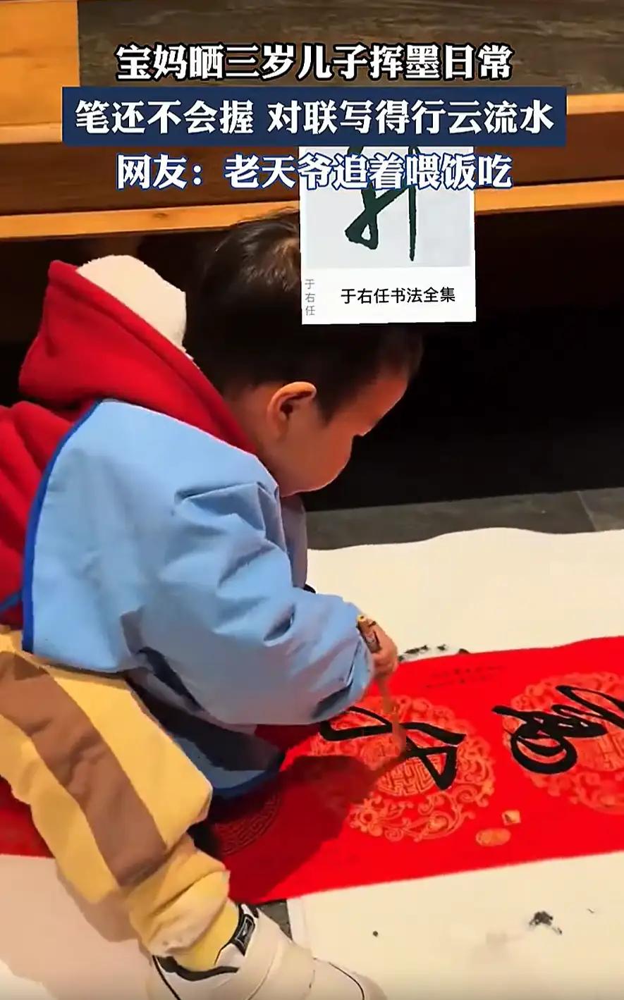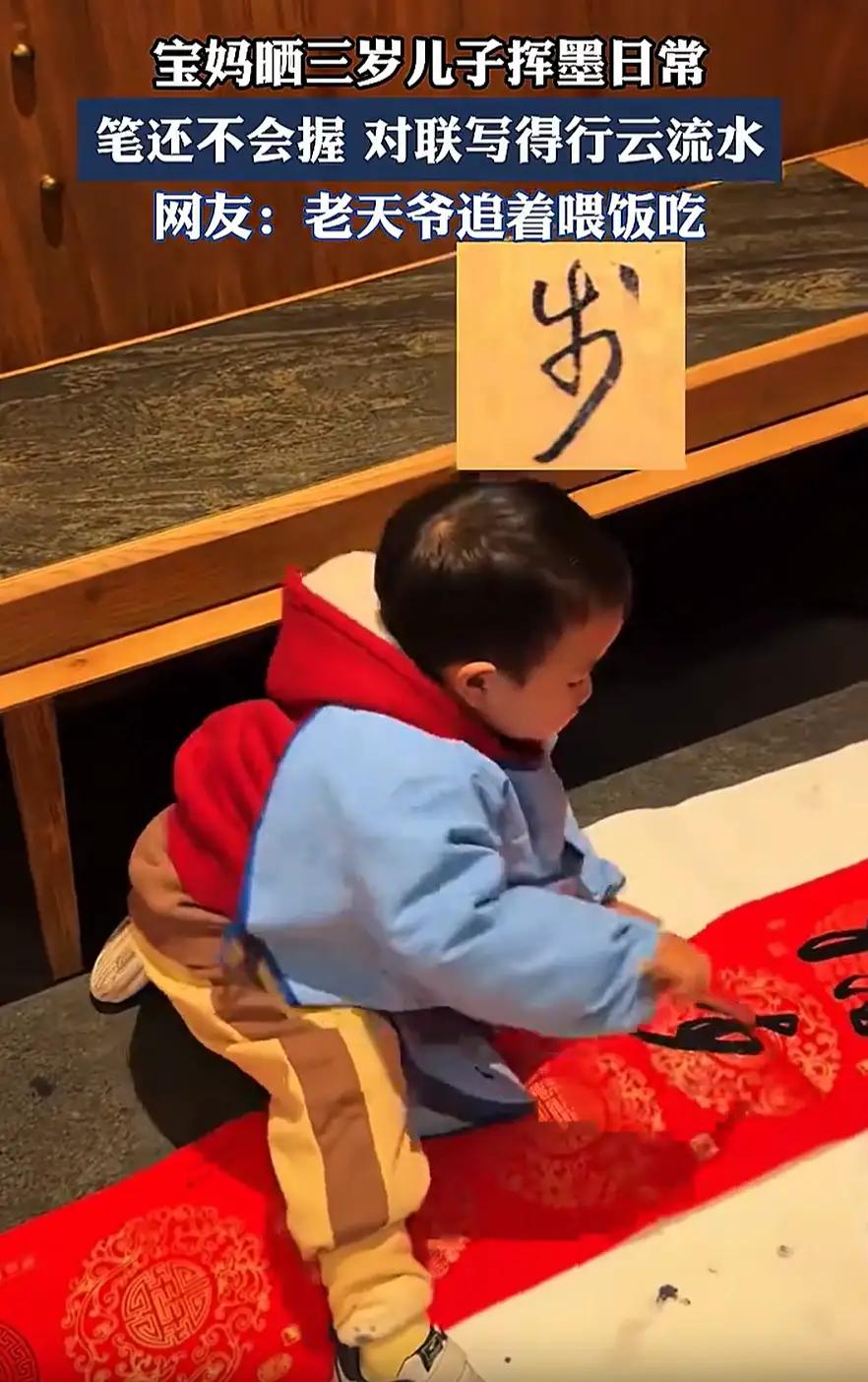 “老天爷追着赏饭吃!”广东惠州,一位妈妈在网上晒视频,三岁的儿子连笔都不会握,却能拿着毛笔行云流水的写出对联,而且和原版复刻度相当高,连央视都忍不住转发。网友:此等天赋,他莫不是穿越者? 最近刷短视频,刷到个特别让人眼前一亮的,广东惠州有位妈妈,在网上晒了自家三岁儿子写毛笔字的视频,没成想火得一塌糊涂,连央视都忍不住转发了,评论区里满是“老天爷追着赏饭吃”的感叹,还有人调侃“这孩子怕不是穿越过来的吧,上辈子的手艺没忘干净”。 你想啊,三岁的小孩,手还肉乎乎的,连拿筷子都没太利索呢,更别说握毛笔了。视频里那小家伙蹲在地上,面前立着张洒金大红对联纸,纸都快比他个子高了。他握笔的姿势哪儿谈得上标准,手腕细得让人担心撑不住吸饱墨的笔,可偏偏笔锋一落,那股子稳劲儿完全不像个三岁娃该有的。 从起笔到收笔,每一笔都写得行云流水,字的结构又工整又好看,连笔锋转折的力度都拿捏得特别准,跟原版对联的复刻度高得吓人。我第一次看的时候都愣了,反复倒回去看了好几遍,总觉得不真实,这哪儿是小屁孩写的字啊,好多成年人练个三五年都未必能有这水平。 底下的评论更是炸开了锅,有人说“这哪是天赋啊,分明是老天爷硬塞饭吃”,还有人开脑洞:“怕不是孟婆汤没喝够吧?上辈子指定是练书法的大师,把本事带到这辈子来了”“穿越者实锤了,不然没法解释这么小的孩子能写这么好”。 这些调侃听着好笑,可也确实说出了大家的惊讶,毕竟三岁孩子能有这手艺,实在超出了一般人的认知。 但看了妈妈后来的分享才知道,这哪儿是什么“穿越者”的玄学啊,全是家里氛围熏出来的。妈妈说,孩子还没学会拿筷子的时候,就天天闻着墨香长大,爷爷爱写毛笔字,她自己也喜欢,家里墙上贴的、桌上摆的,到处都是笔墨纸砚。 对别的小孩来说,玩具是积木、小汽车,可在这个家里,毛笔就跟玩具一样平常,孩子从小看惯了大人写写画画,自然就不觉得陌生。 就连孩子第一次碰毛笔,也没什么刻意的训练。 妈妈说,就是有次随口教他念“顺风顺水顺财神”,小家伙觉得顺口,跟着念了几遍,然后就顺手拿起了旁边的毛笔,像模像样地在纸上划拉。没有谁逼着他坐端正、练描红,也没有谁规定他要写得多好,就是觉得好玩、好奇,自然而然就接触了。 更让人佩服的,其实是这孩子的专注力。你也知道,三岁的小孩正是满地跑、一刻都闲不住的年纪,能安安静静坐两分钟都难。可这小家伙一握住毛笔,整个人都静下来了,眼里好像就只有手里的笔和纸上的字,外界的动静仿佛都跟他没关系。 那种沉得住气的样子,别说跟同龄孩子比了,连好多成年人都自愧不如——现在大家生活节奏快,能安安心心专注做一件事的时间都少得可怜,可一个三岁娃却能轻易进入这种状态。 其实一开始我也跟网友一样,觉得这孩子就是“神童”,天赋异禀。 可仔细想想,哪有什么凭空来的天赋啊?要是没有家里满屋子的墨香,没有爸妈不催不逼、让他自由接触的态度,就算孩子有兴趣,也未必能这么自然地把字写好。好多人总想着“天才”是天生的,却忘了“天才”也需要土壤就像一颗种子,得有合适的环境,才能慢慢发芽长大。 评论里还有人猜,是不是家长搞了“魔鬼训练”,或者有什么特殊基因。可事实根本不是这样,妈妈说从来没强迫过孩子,也没刻意教过笔法,就是让他跟着感觉来,喜欢写就写,不想写了也不勉强。这种不焦虑、不功利的态度,反而让孩子保留了对书法最纯粹的兴趣,写的时候也没压力,才能越写越好。 现在再看这个视频,就不只是觉得“厉害”了,更多的是觉得温暖。 不是说孩子写得多好有多了不起,而是看到一个家庭用最轻松的方式,守护了孩子的兴趣和专注。网友调侃“穿越者”,说到底也是觉得这孩子的本事难得,可其实最难得的不是那手好字,而是他眼里对书法的喜欢,还有爸妈愿意不打扰、不施压的耐心。 更多的是“有人用心护着那碗饭”。比起急着给孩子贴“神童”“穿越者”的标签,倒不如学学这家人的态度,给孩子多一点耳濡目染的环境,少一点急功近利的要求,说不定反而能让孩子的兴趣慢慢长成意想不到的样子。毕竟对孩子来说,能开开心心做自己喜欢的事,比什么“天赋”“本事”都重要。