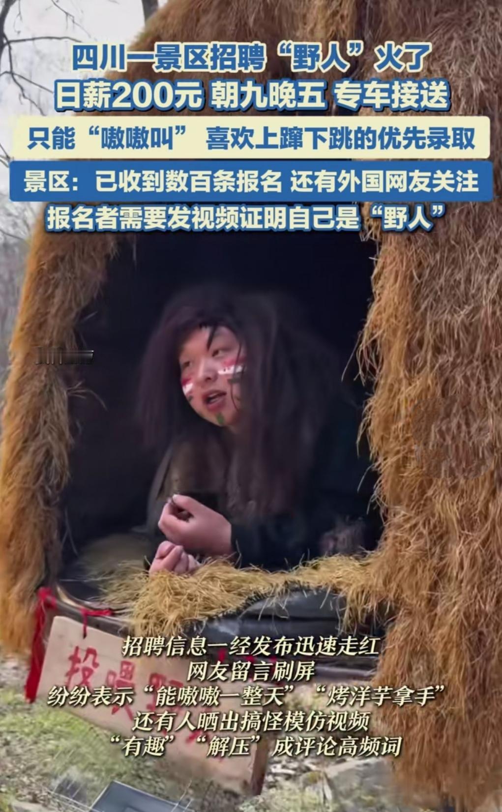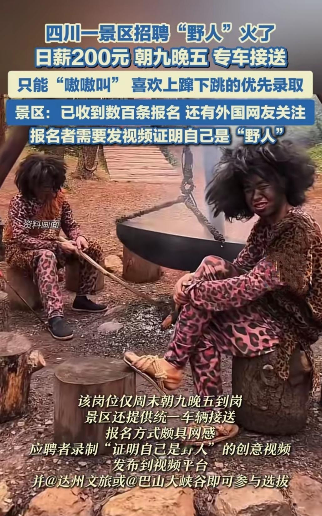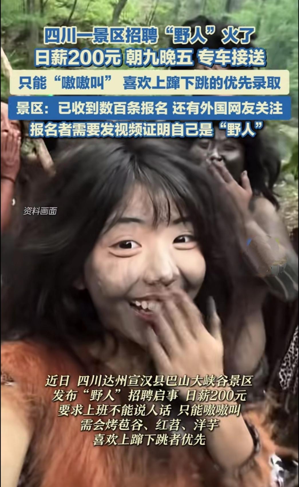 刷到四川达州的“野人”招聘时,我直接笑出声!不用坐班内卷,不用勾心斗角,每天“嗷嗷叫”、烤烤苞谷红薯就日赚200,这工作也太颠覆认知了吧? 其实这是巴山大峡谷景区的创意操作,从12月9日开始招聘,要求全程不说话、爱“上蹿下跳”,周末还能正常休息。报名方式也简单,发创意视频带话题@官方就行,现在已经收到上千条咨询了。 看似离谱的招聘,背后其实是景区的文旅巧思。想冲刺5A景区,靠的不是千篇一律的宣传,而是这种接地气的沉浸式体验,既让巴文化活了起来,又戳中了年轻人的兴趣点。 不得不说,现在的景区越来越懂年轻人了!用轻松有趣的方式传递文化,既赚足了热度,又让大家记住了景区特色,这样的创意真该多来点~