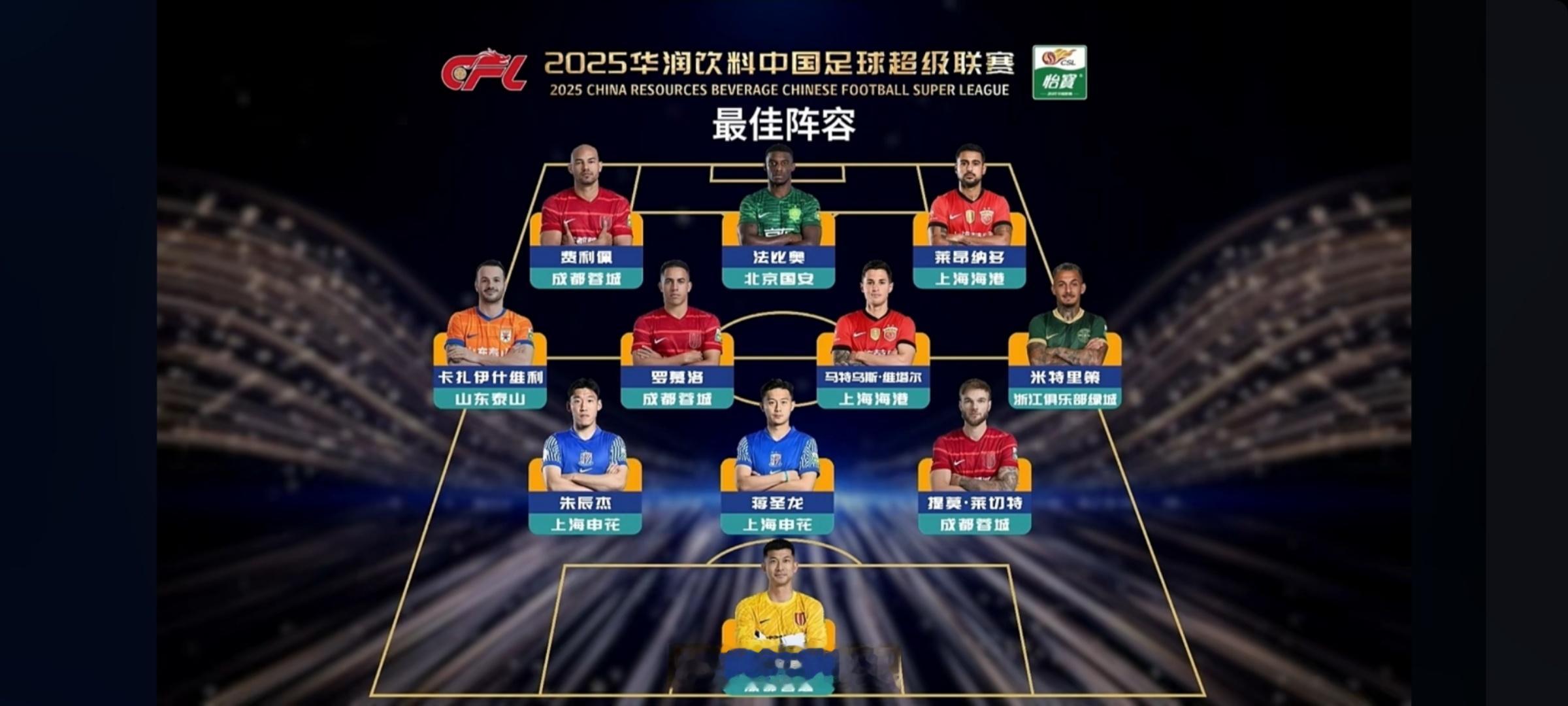 2025中超最佳阵容当中,成都蓉城有4人入选,刘殿座、罗慕洛、提莫、费利佩蓉城4将太棒了中足联颁奖典礼2025赛季中国足球职业联赛颁奖会