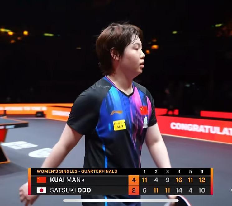 蒯曼晋级四强后表示:落后时的心态比较好,半决赛不管对战莎姐还是长崎,都会全力以赴! 12月12日,香港总决赛女单1/4决赛 蒯曼4:2大藤沙月,晋级半决赛! 赛后采访中蒯曼表示: “今天落后时的心态比较好, 能晋级半决赛非常高兴, 明天的比赛不管对战莎姐 还是长崎,我都将全力以赴!” 现场观众纷纷高喊“莎姐”, 蒯曼笑的开心 , 爱笑的女孩运气不会差, 蒯曼加油!