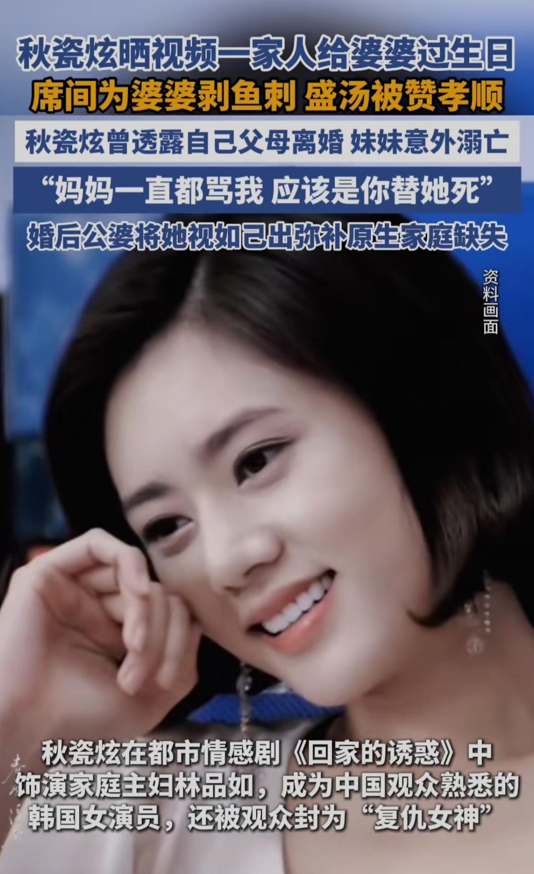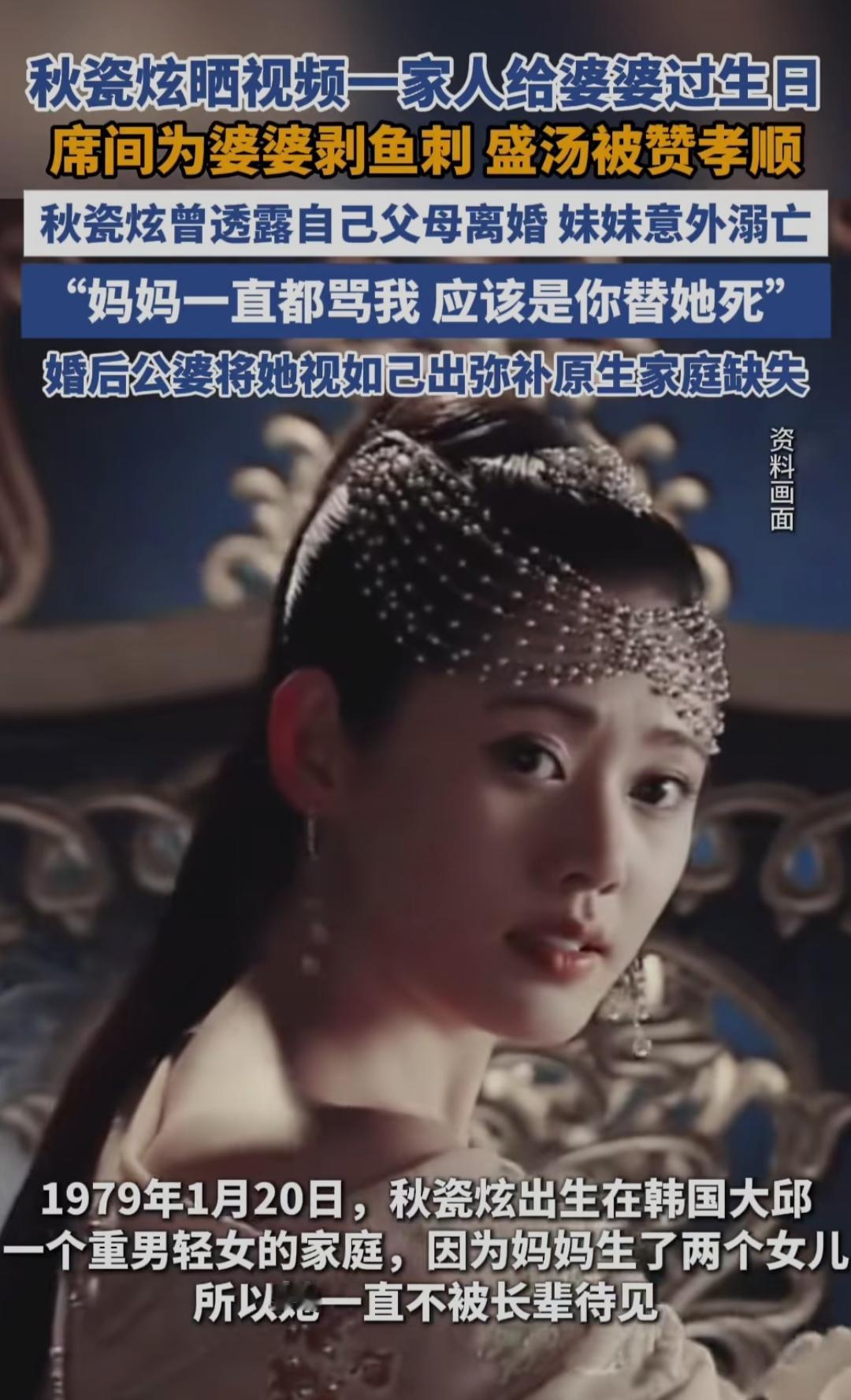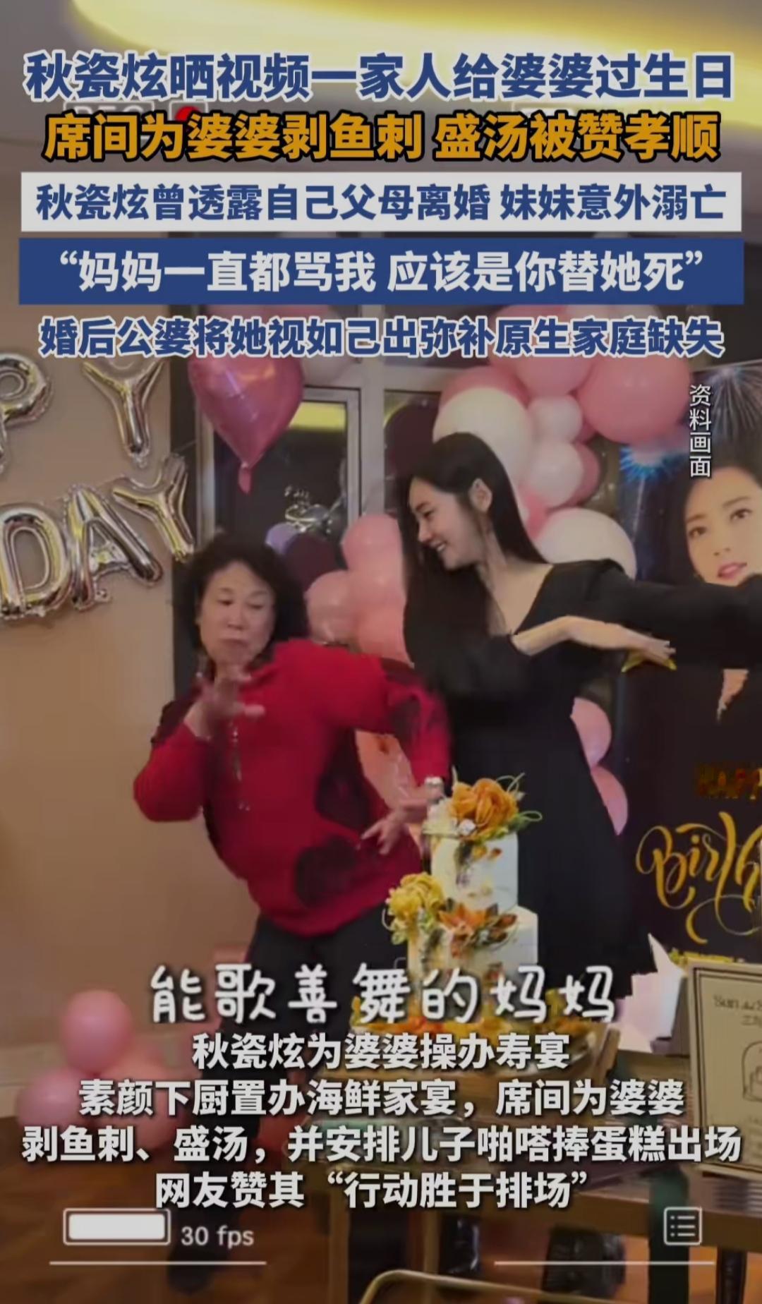 刷到秋瓷炫为婆婆庆生的视频,我忽然懂了什么叫“爱出者爱返”:她把婆家给的偏爱,都揉进了剥鱼刺、盛汤的细碎温柔里。 这位在原生家庭受尽委屈的姑娘,父母离婚、妹妹溺亡,还被母亲恶语指责,从小没尝过被疼爱的滋味。直到嫁入于家,公婆把她当亲女儿对待,才让她补上了人生里缺失的亲情课。 这次寿宴她素颜下厨做海鲜宴,没有铺张的排场,只有亲手为婆婆处理鱼刺、贴心盛汤的细节,甚至安排儿子捧着蛋糕出场制造惊喜。网友说她“行动胜于排场”,其实这不过是她把收到的爱,认认真真地还了回去。 原生家庭的伤口或许难愈合,但好在秋瓷炫遇到了把她捧在手心的婆家,让她终于活成了被爱包围的模样,这大概就是对“家”最好的诠释吧。