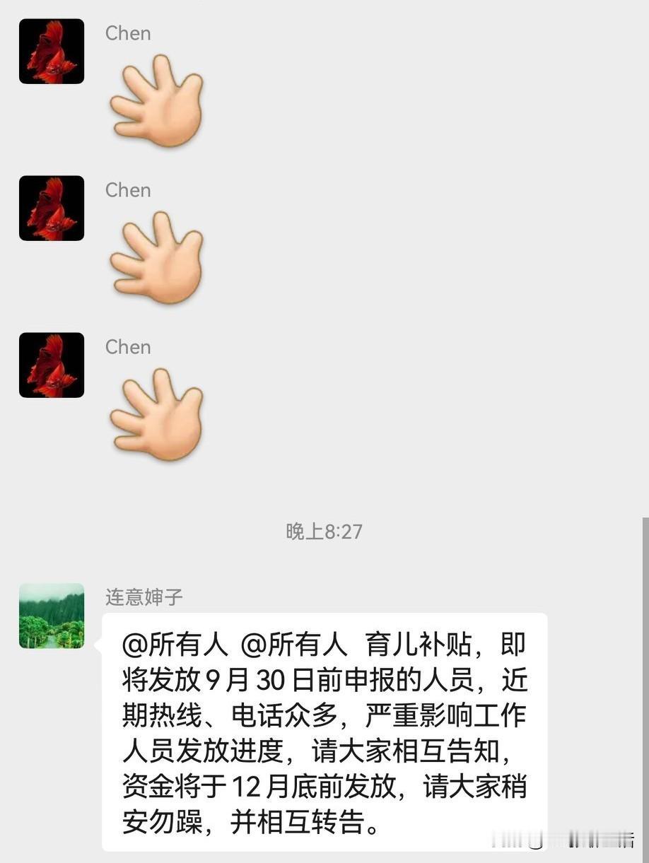 你们那的育儿补贴发了吗? 刚刚收到群通知,如下: @所有人 @所有人 育儿补贴,即将发放9月30日前申报的人员,近期热线、电话众多,严重影响工作人员发放进度,请大家相互告知,资金将于12月底前发放,请大家稍安勿躁,并相互转告。 感情是,发放育儿补贴的人员忙着去接电话了啊!8月份申请的,一直纳闷,怎么还没收到呢?原来是电话占线