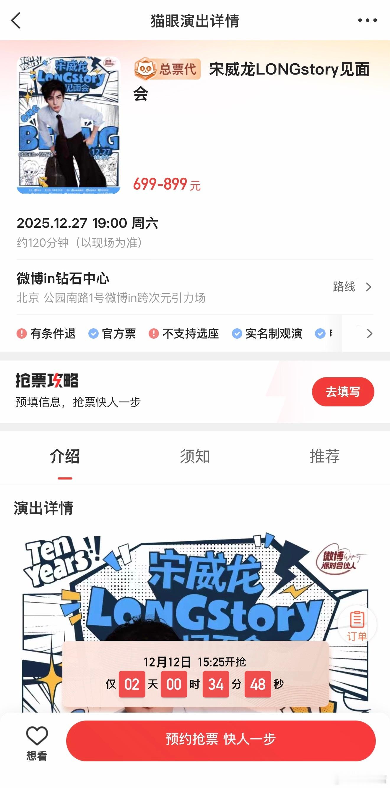 宋威龙见面会今日开票宋威龙见面会秒罄 十年时光匆匆,宋威龙就像一颗璀璨星辰一直闪耀在心间。今日下午15:25🐱开票,这是和龙龙的珍贵之约,我已做好抢票准备,一定要到现场感受他的魅力!