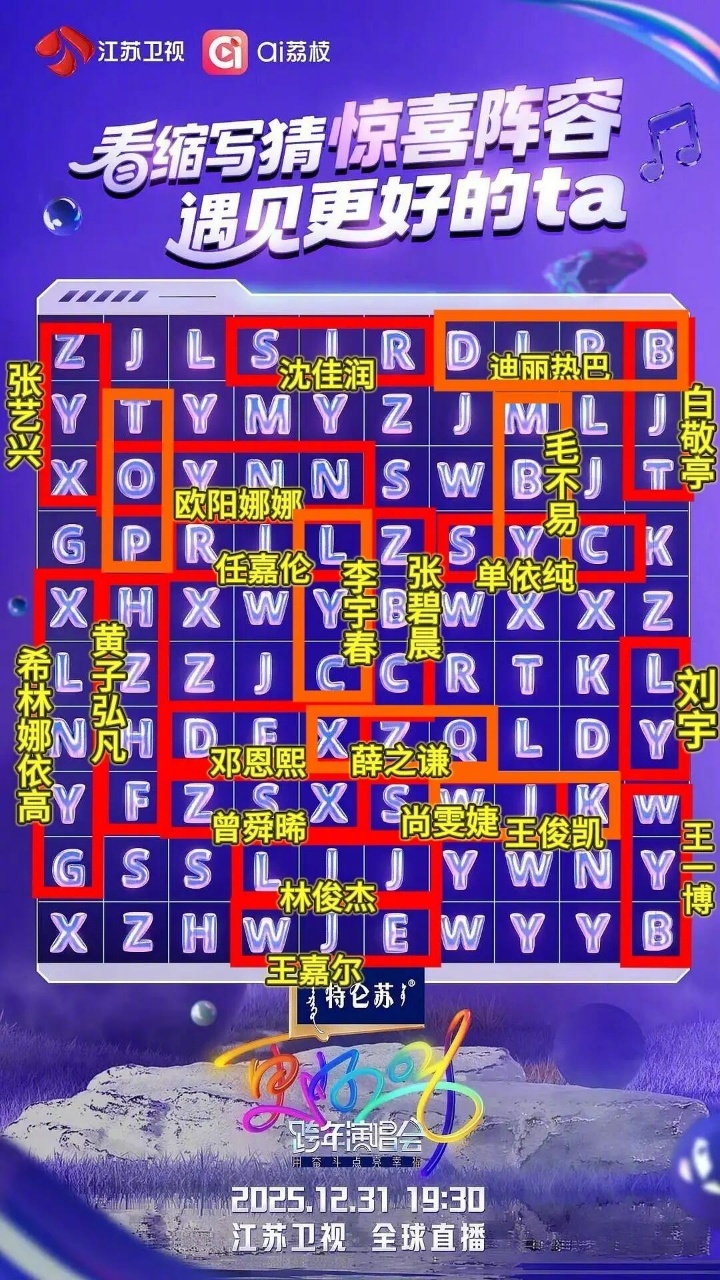 江苏卫视跨年你还我脑子 跨年晚会惊现“学霸题”,江苏卫视的缩写笔画数猜歌手,让观众直呼费脑,考研人却轻松拿捏,认出王俊凯黄子弘凡,太绝了。 江苏卫视跨年