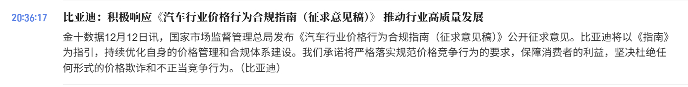 迪厂的响应速度非常快。国家市场监督管理总局发布《汽车行业价格行为合规指南(征求意见稿)》公开征求意见,落实规范价格竞争行为。迪厂刚才就回应了:积极响应。这就是大厂的风范,你可以看到过去的半年时间,迪厂在干啥?在普惠高端科技,让全民受益。在明年,可以预测到,不卷价格,咱们可以用独一份的技术来说话。消费者明年重点看的就是:技术、配置和权益。这些迪厂都准备好了。就等一个个牌打出来。