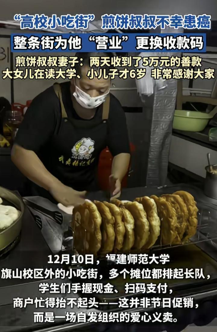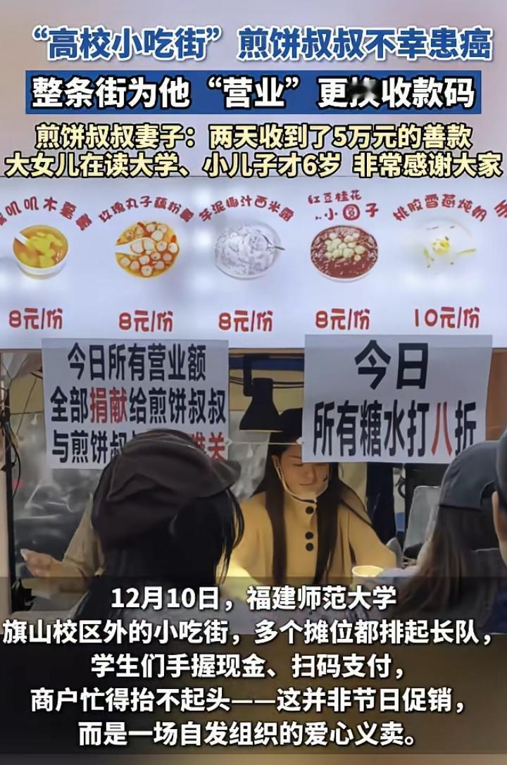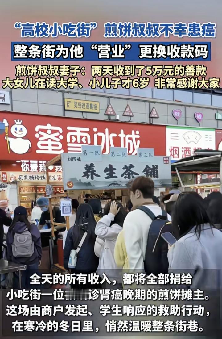 这样的爱心捐款太实在了,真正的落到了实处 高校小吃街的煎饼叔叔患癌症,整条街的摊位为他“营业”,所有的收款码都换成了煎饼叔叔的,多个摊位上都排起了长队,两天收到了5万元的爱心捐款,这是商户们自发组织,学生积极响应的一场爱心传递 虽是寒冬,商户和学生们的举动让人心暖,爱出者爱返,福往者福来,这一场爱心的传递温暖了所有人的心田,给他们点赞了[赞] 图片及素材源自网络