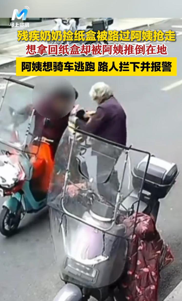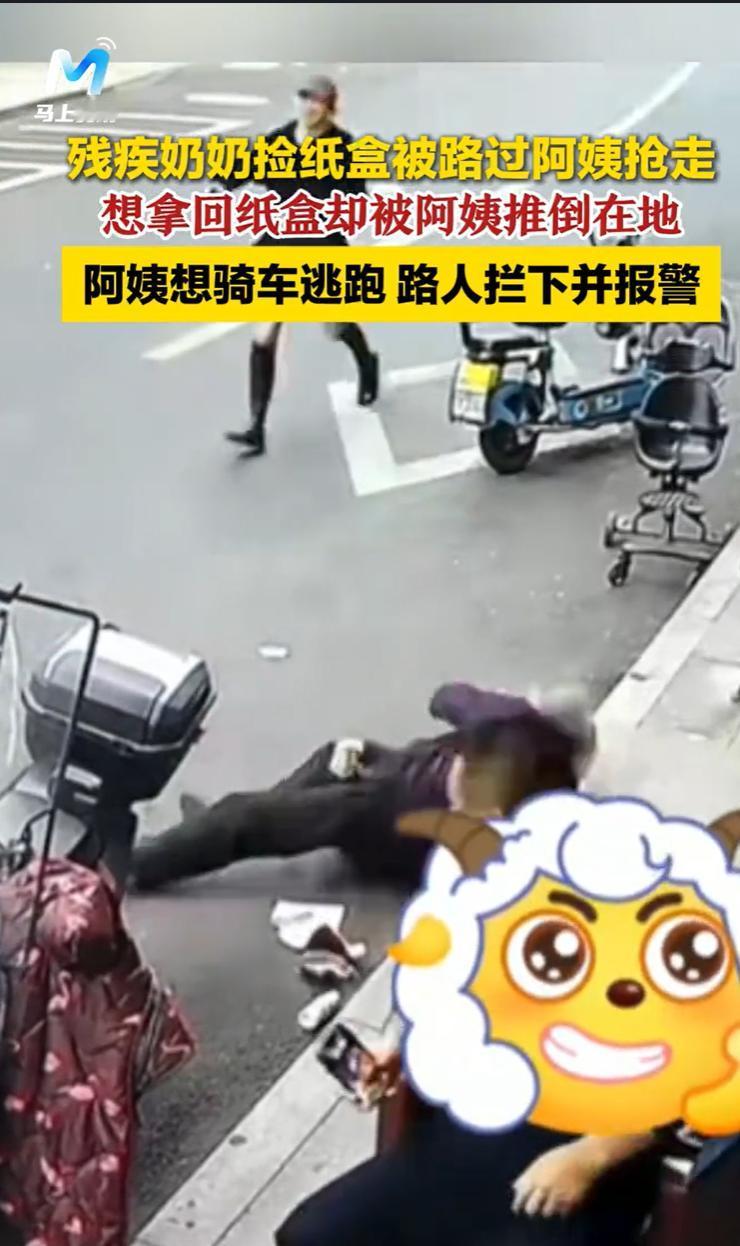 浙江温州,一五金店店主特意在门口给巷子里那位聋哑拾荒阿婆留着一叠废纸箱,阿婆刚搬走第一摞,正吃力地蹬着旧三轮准备回来取剩下的。不料,一位大妈停下车,手脚麻利地将剩下的纸箱往自己车上塞。此时阿婆恰好回来,喉咙里发出急促的“哎哎”声,急忙上前按住最后几个纸箱。大妈抬头瞥了一眼,非但没停手,反而用力扯过纸箱,顺势将阿婆推得踉跄后退。“砰!”阿婆佝偻的后背狠狠撞上水泥路沿,倒地不起。大妈头也不回,坐上电动车就要离开。“站住!”店主从店里冲出来,一把死死抓住车尾架,果断报警,阿婆被送医救治。   70多岁的阿婆双手有着明显的残疾,手指弯曲变形,无法正常抓握物件,更令人心疼的是,她不能说话,只能从喉咙里发出“哎、哎”的声音与外界交流。   每天清晨,阿婆推着一辆锈迹斑斑的旧三轮车,穿梭在巷弄之间,捡拾被人丢弃的纸箱、塑料瓶。   那双残疾的手动作缓慢却执着,总要尝试好几次才能将一个纸箱压平捆好。废品回收站每周去一次,换来的几十元钱是她主要的生活来源。   好在,这条老街上的邻里们格外关照她,每当家里有闲置的废旧纸箱,都会主动放在门口显眼处,等着阿婆来取。   12月10日,开五金店的店主小李整理仓库,清出了一批纸箱,整整齐齐地捆好放在店门口。他知道阿婆下午会经过这里,特意留给阿婆的。   下午三点左右,阿婆的三轮车吱呀吱呀地停在店门口,看到那堆纸箱,她脸上露出难得的笑容,眼睛眯成两条缝。   阿婆先搬了一部分放到自己车上,但车太小,一次装不完。阿婆比划着示意自己还会回来,然后费力地蹬着三轮车往回收站方向去了。   约莫二十分钟后,当阿婆返回准备搬运剩下的纸箱时,却看到一位骑着电动车、约五十多岁的大妈停在店门口,正迅速地将剩下的纸箱往自己车上搬。   阿婆急忙停好三轮车,小跑着上前,站到了纸箱跟前,用手指指纸箱,又指指自己,嘴里发出“哎、哎”的声音,尝试告诉大妈,这些东西是她的。   大妈抬头瞥了阿婆一眼,手上的动作却丝毫没停,她大概觉得谁捡到就是谁的,完全无视站在眼前的阿婆。   纸箱被一个个塞进电动车踏板和车篮里,很快就被搬空了。   阿奶奶的“哎哎”声越来越急促,她伸手想拉住最后一个纸箱,却被大妈一把推开。   大妈嚷嚷着:“你干嘛?这些又没写你名字!”   当大妈把最后几个纸箱胡乱塞好,坐上电动车准备离开时,阿婆追了上来,双手拉住电动车后架。   大妈回头一看,竟用力一推,阿婆踉跄后退几步,脚后跟绊到路沿,整个人向后重重摔去。   “砰”的一声闷响,阿婆的背部结结实实磕在坚硬的水泥路沿上,她躺在地上,试图用手撑起身体,但那双残疾的手使不上力,试了几次都没能成功。   推倒老人的大妈此刻才显出一丝慌乱,但她选择的不是扶起老人,而是加大电动车油门试图逃离现场。   车轮刚转动,五金店的小李已经冲了出来,阻止大妈离开,并第一时间报警,还拨打了120。   事后,阿婆被送往医院治疗。   那么,从法律角度,这件事如何评价呢?   1、案涉纸箱是店主赠与给阿婆的,且完成了双方默认的交付动作,所有权归阿婆所有,而非无主物。   《民法典》第六百五十七条规定,赠与合同是赠与人将自己的财产无偿给予受赠人,受赠人表示接受赠与的合同。   本案中,纸箱源于店主整理自家店铺产生,其原始所有权属于店主,但店主将纸箱整理并放置于门口,目的是赠与经常在此拾荒的阿婆。   尽管赠与合同通常为非要式合同,但店主以实际行动发出了明确的赠与要约,而老人此前已通过“搬走第一部分”的行为作出了接受赠与的承诺,老人拾荒的习惯以及之前已取走部分的行为,构成了符合该特定情境交易习惯的默示承诺。   而在老人第一次取走部分纸箱时,就那部分纸箱而言,赠与合同已然履行完毕,所有权从店主转移至老人。   因此,在涉事大妈出现时,剩余的纸箱并非无主物,其所有权已归属于老人。   2、涉事大妈“拿”纸箱并“推倒”老人的行为不仅仅是民事侵权,甚至治安违法、刑事犯罪。   涉事大妈在明知老人主张权利且正在进行占有的情况下,强行取走纸箱,侵犯了老人的财产所有权,依法应当承担返还财产、赔偿损失等责任。   除此之外,虽然纸箱价值较低,该行为可能构成《治安管理处罚法》第四十九条所规定的“抢夺”公私财物的违法行为依法可处以拘留、罚款。   而涉事大妈推倒老人的行为,更为严重,甚至构成刑事犯罪。   涉事大妈是故意推搡,而非无意碰撞,若阿婆伤情经鉴定为“轻伤”或以上,则涉事大妈的行为涉嫌构成《刑法》第二百三十四条规定的故意伤害罪。   若伤情为“轻微伤”,则该行为构成《治安管理处罚法》第四十三条规定的“殴打他人”或“故意伤害他人身体”的违法行为,应受行政拘留、罚款等处罚。   对此,您怎么看?