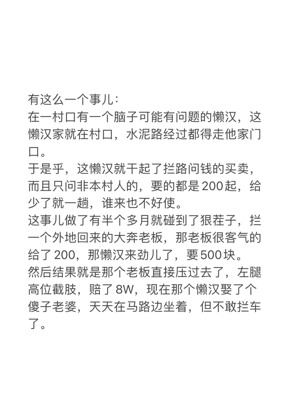 于是乎,这懒汉就干起了拦路问钱的买卖,而且只问非本村人的,要的都是200起,给少了就一躺,谁来也不好使。