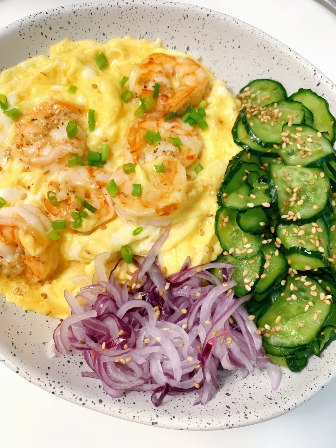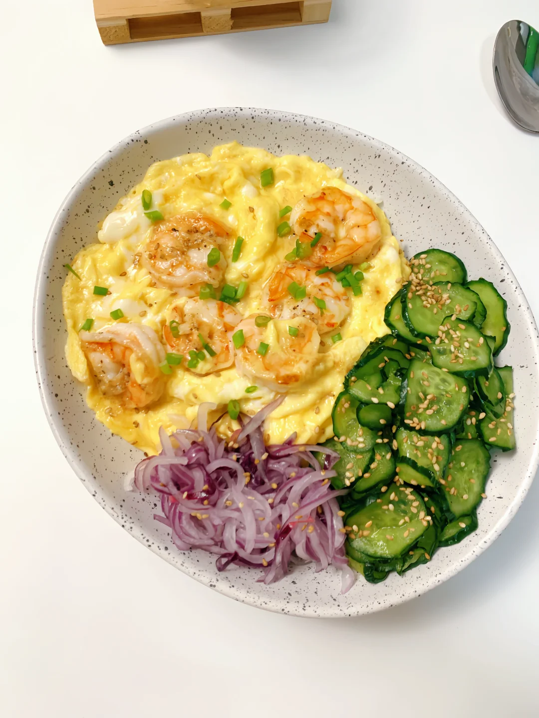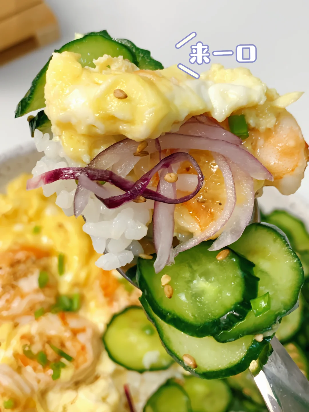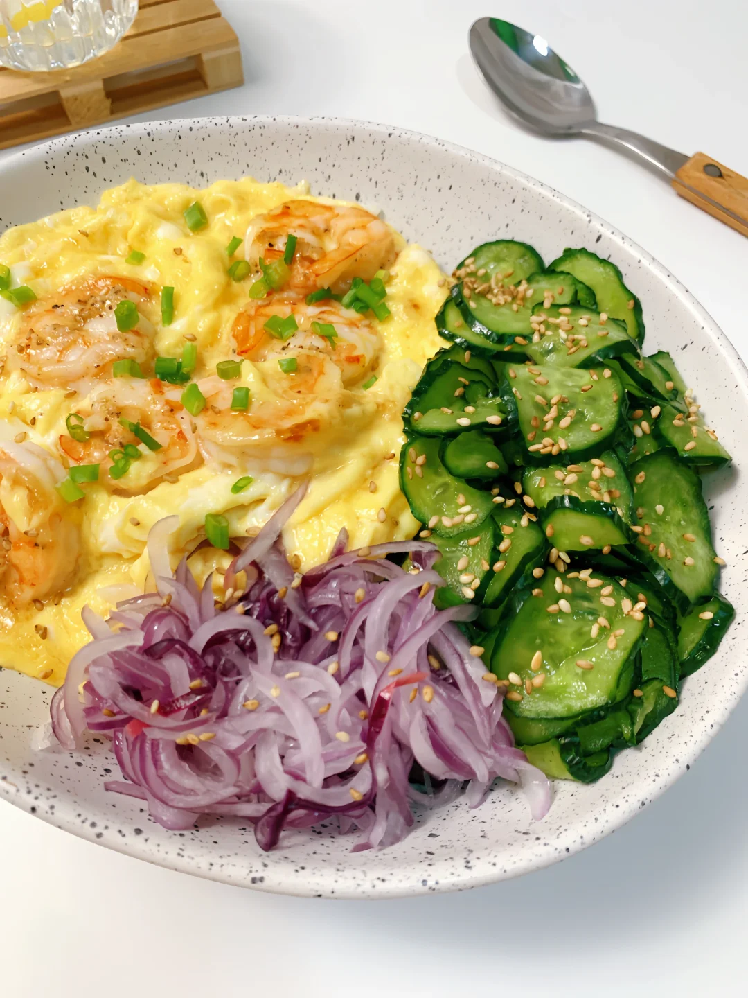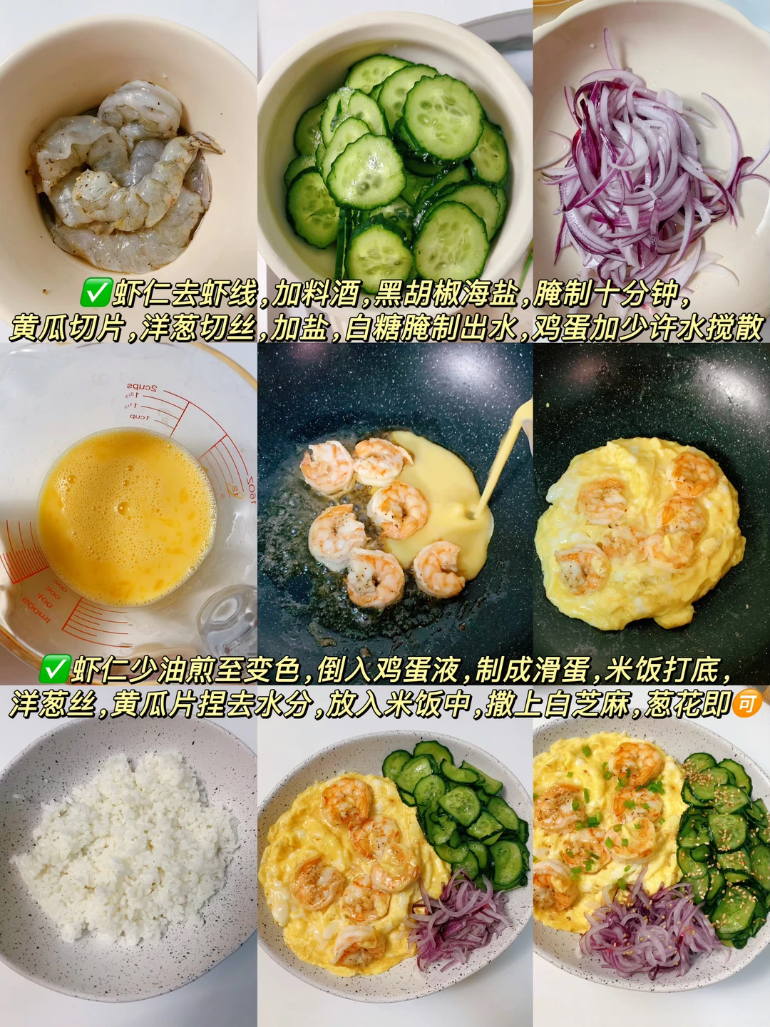 今日分享🥣盐渍黄瓜滑蛋盖饭~ 减脂餐的终点🏁是家常菜,虾仁滑蛋鲜嫩Q弹,蛋白质UP UP,黄瓜洋葱丝脆爽,搭配一杯柠檬水清爽好吃,百吃不腻[庆祝R] [向右R]欢迎进入我的主页收藏……………………………… 做法见图片7️⃣ 🕒时间:15-20分钟 🤞难度:⭐⭐
