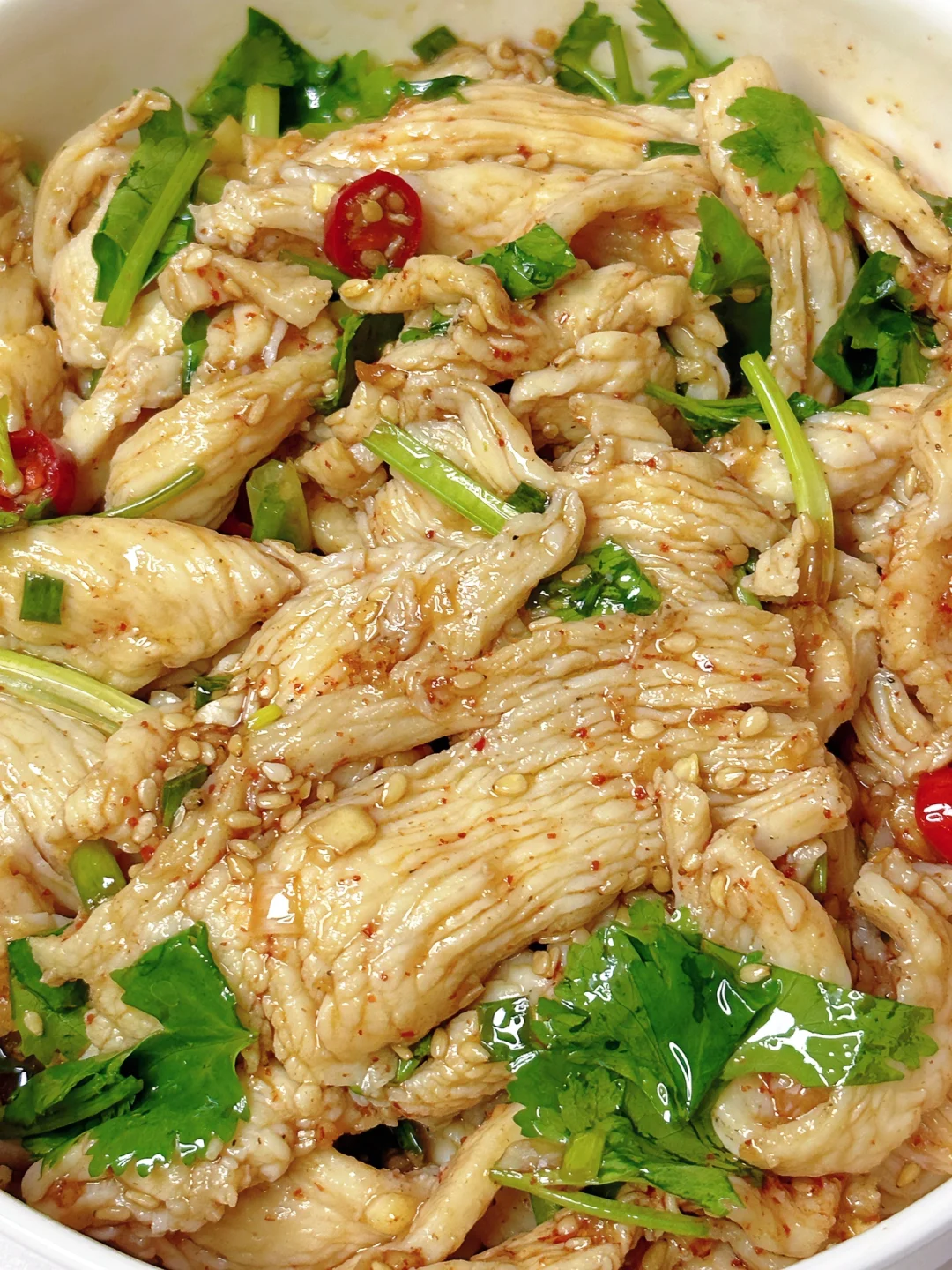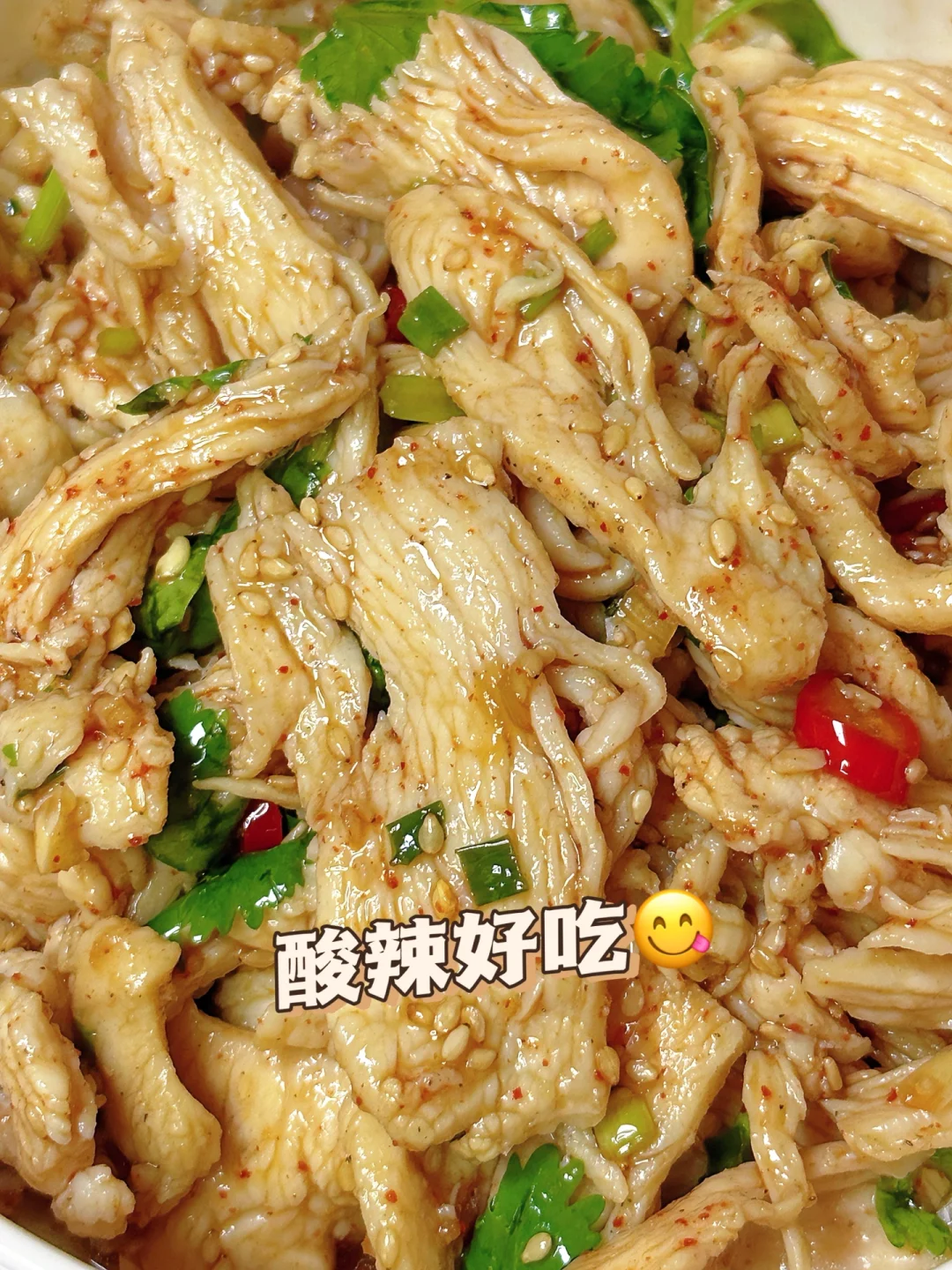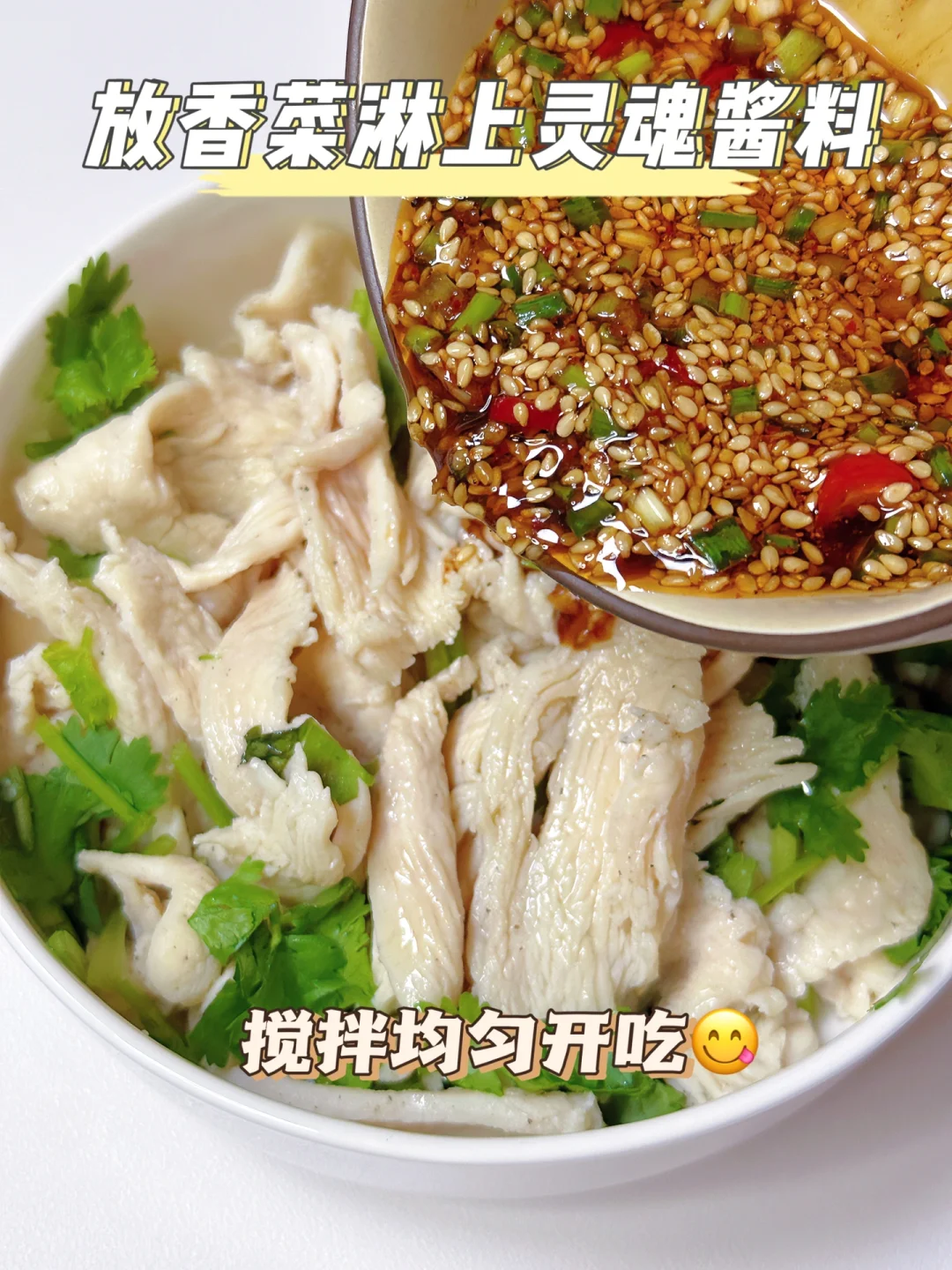 5⃣️鸡胸肉捞出放上香菜淋入灵魂酱料搅拌均匀即可开吃