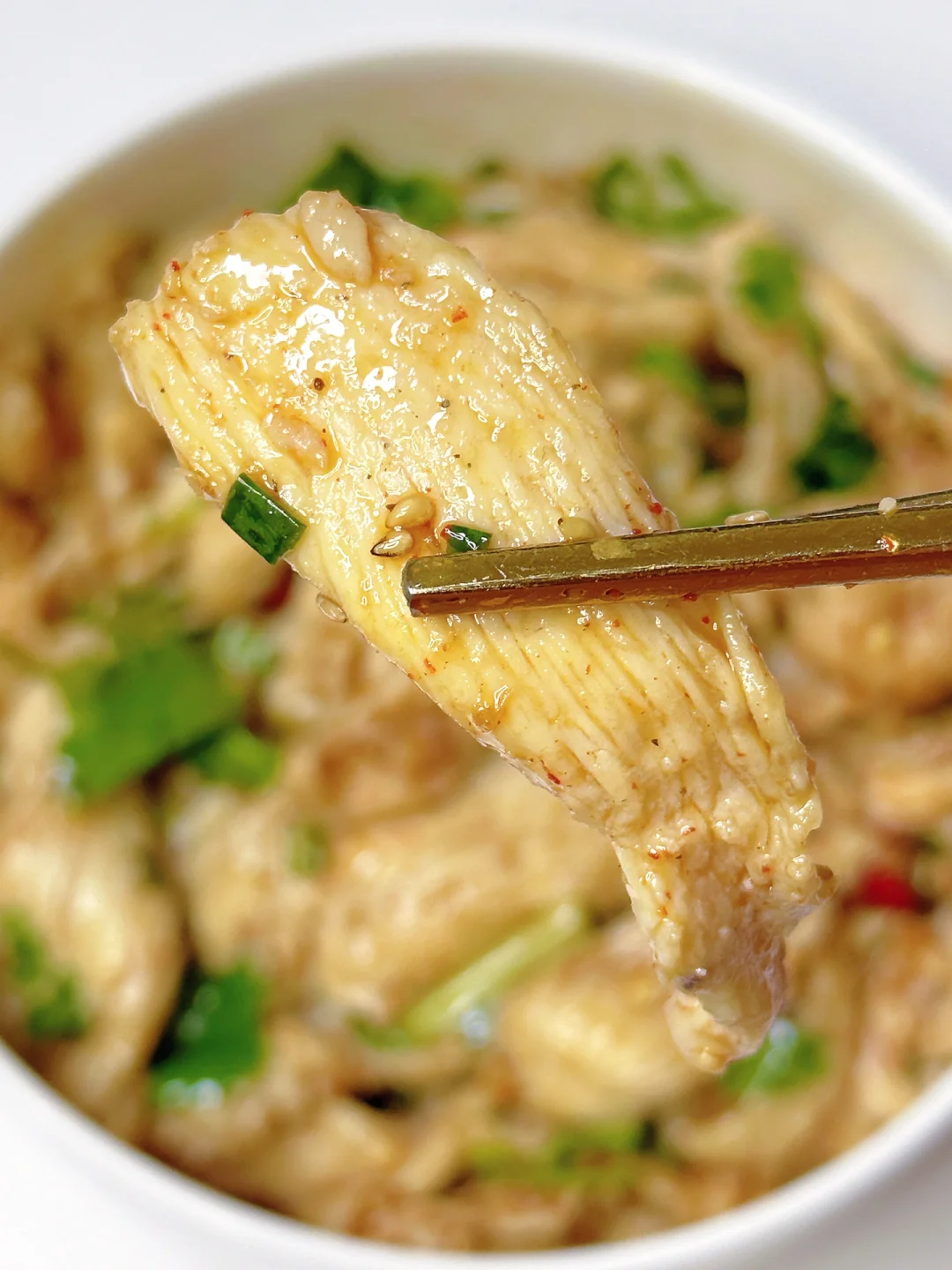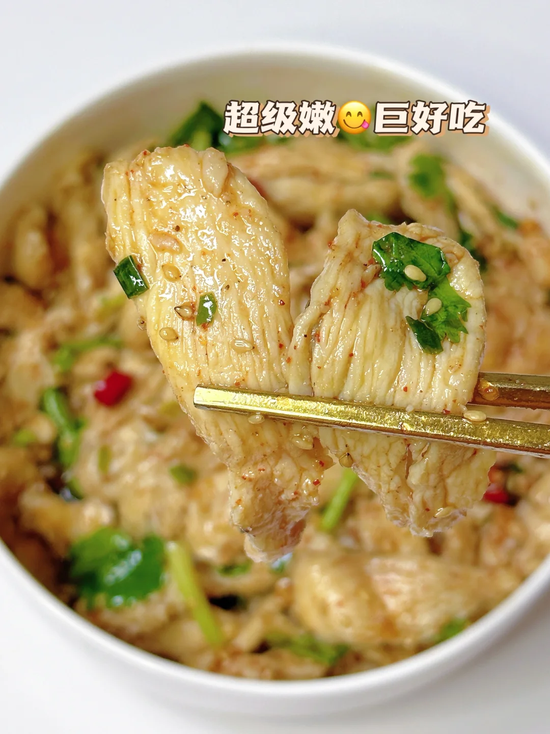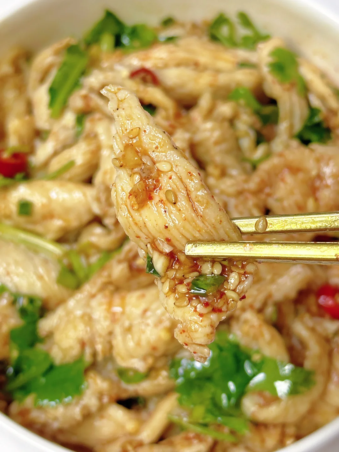 5⃣️鸡胸肉捞出放上香菜淋入灵魂酱料搅拌均匀即可开吃