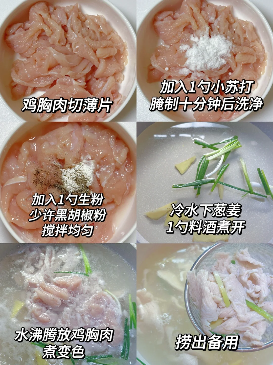 1⃣️鸡胸肉切薄片,放一勺小苏打腌制十分钟后洗干净滤干水