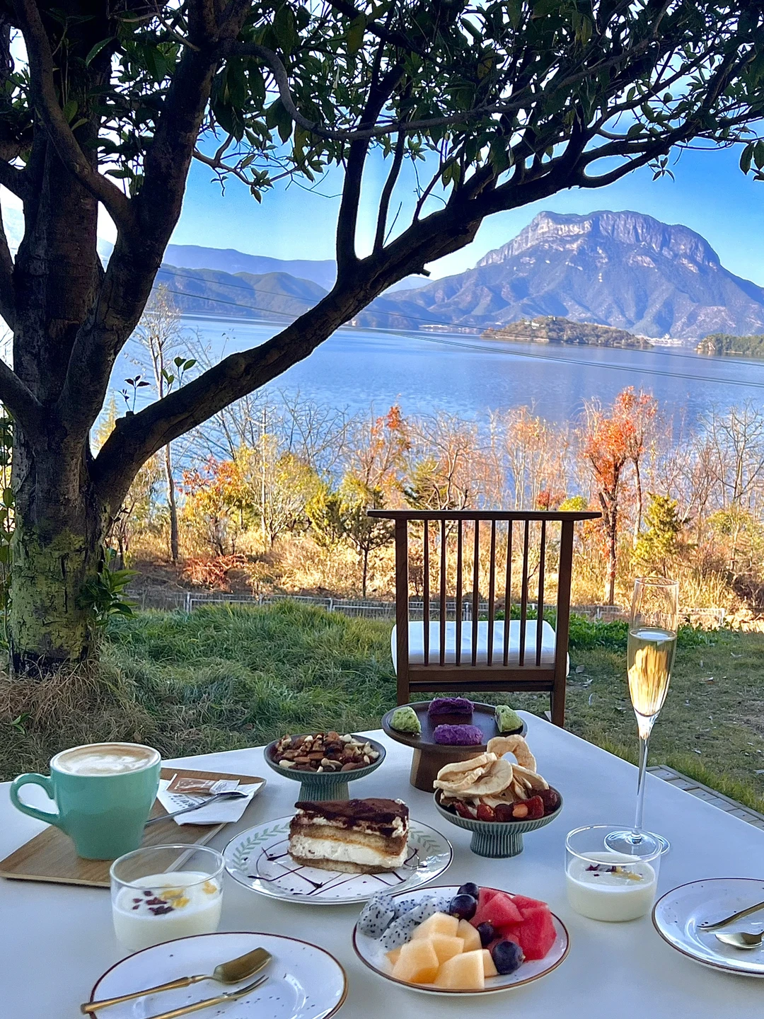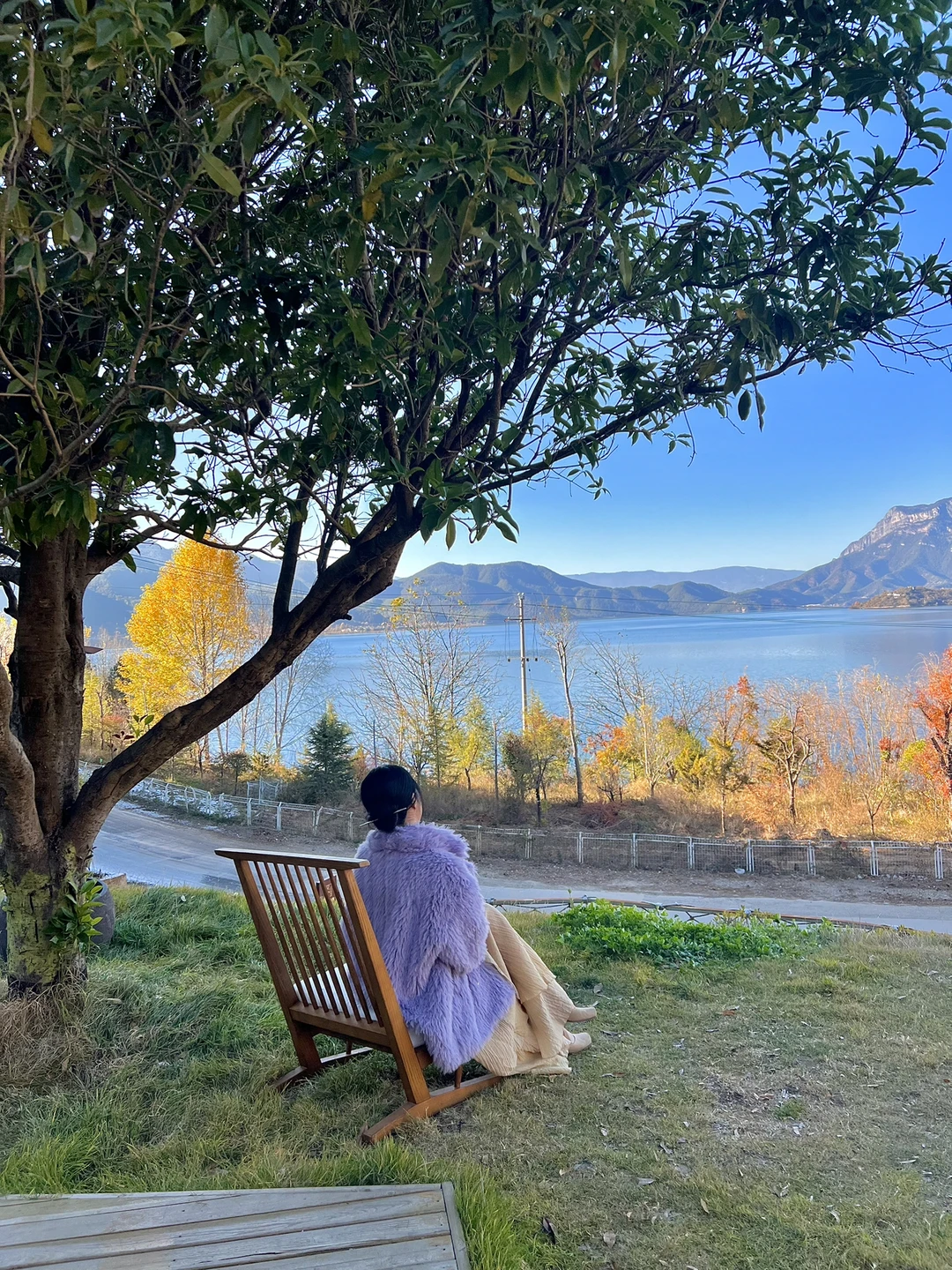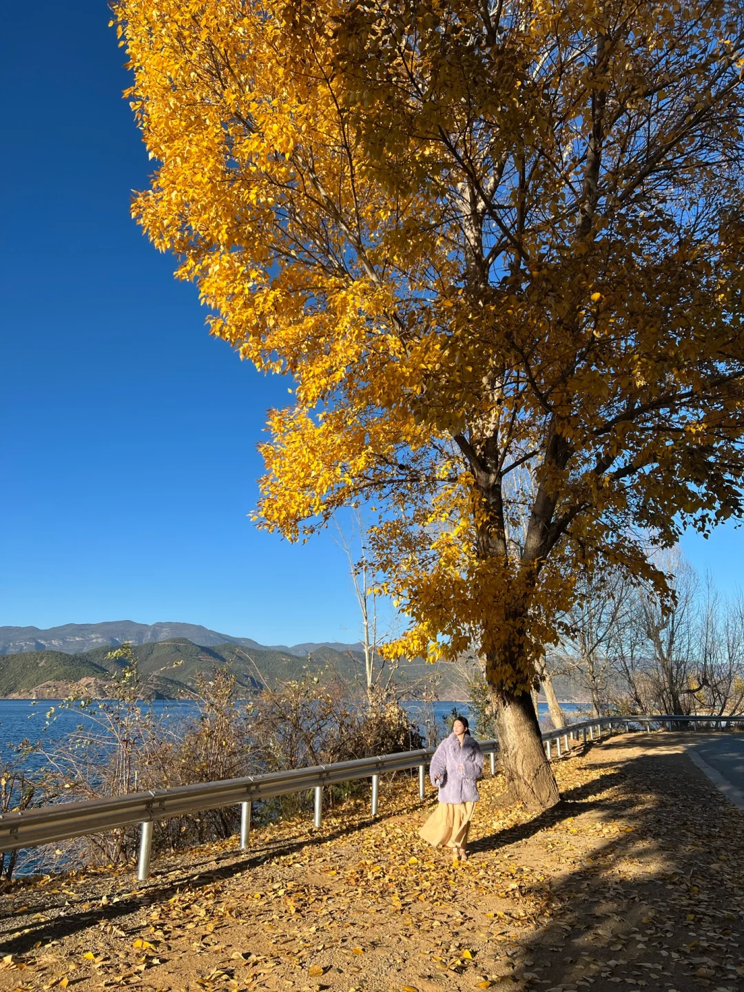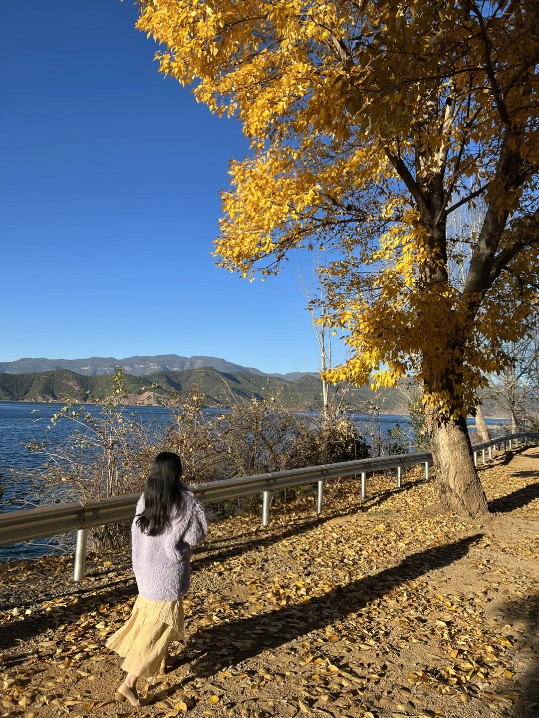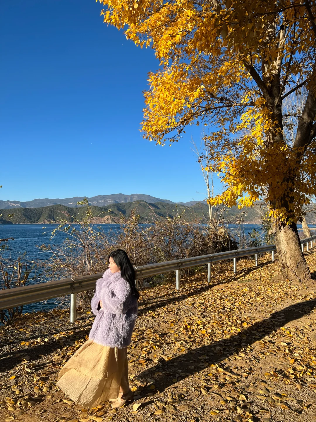 来丽江旅游一定要来泸沽湖玩一圈! 这次在泸沽湖就待了2天 慵懒的午后在草坪上喝下午茶晒着太阳 也太惬意了 - 环湖游刚好遇到落叶 收到了属于秋冬的浪漫 照片摄于12月中哦 - 皮草外套:Three Quarters Quarters -