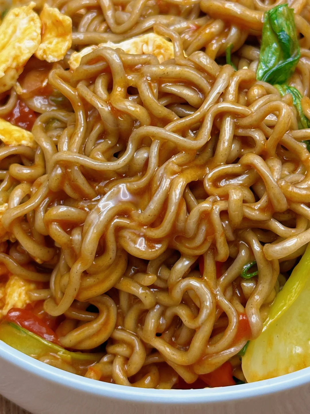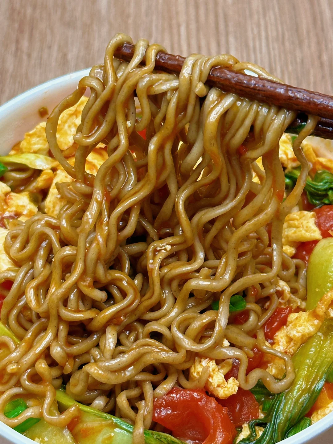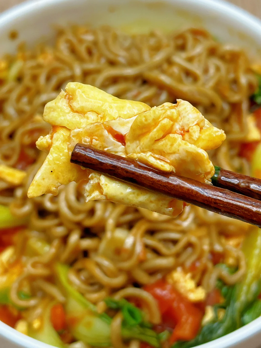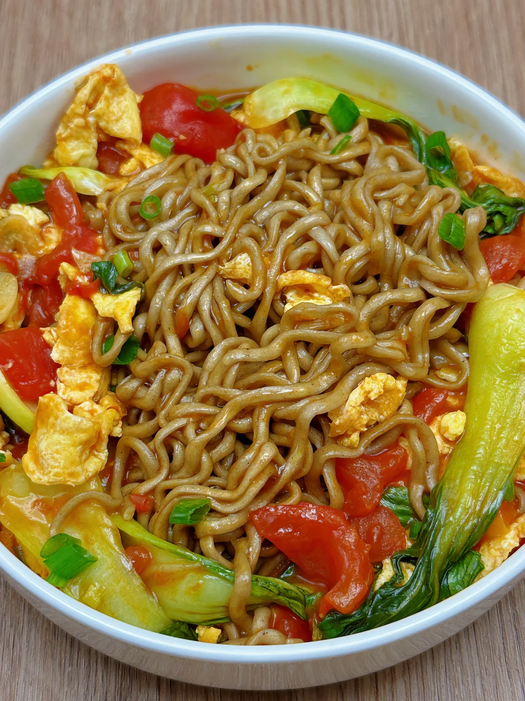 3️⃣少油放入蒜末、葱花炒香放入了番茄丁炒出沙,淋入调好的酱汁,放入鸡蛋、青菜、荞麦面盖盖子,小火焖煮3分钟出锅,开吃