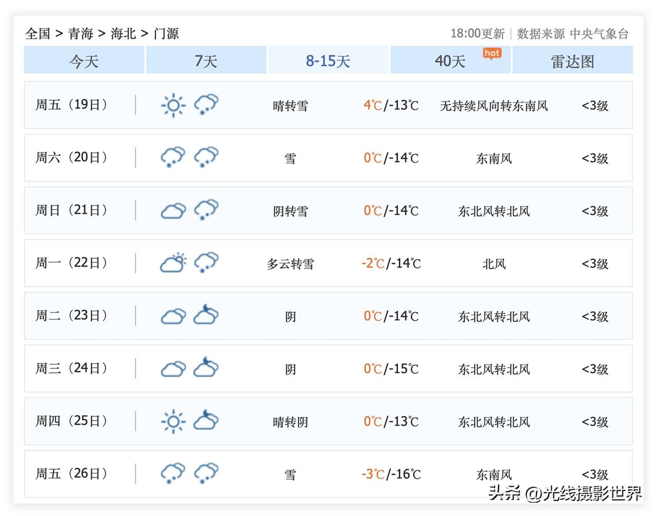 不错不错,兰新高铁的祁连山脚下的青海门源,12月19日到22日可能每天都要下雪……12月26日可能会再次下雪……兰新高铁,西宁--门源--山丹--张掖……这一带雪后的祁连山,会更加的值得去看看啊! 想要看中国最美雪国列车的摄影发烧友们,可以蠢蠢欲动,可以开始关注啦!