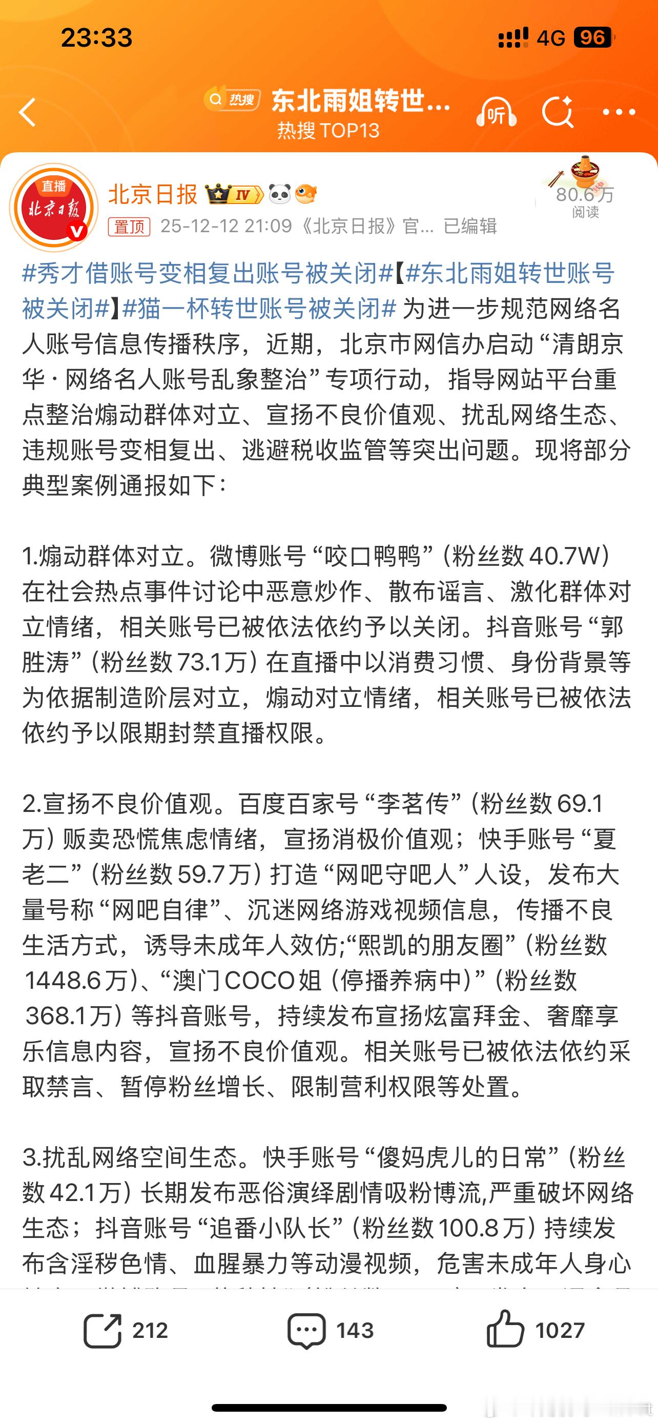 东北雨姐转世账号被关闭网络名人账号关注度高、影响力广,是构建清朗网络生态的重要力量。作为网络名人,就应该要以身作则,得考虑到自身行为带来的影响,所以不只是道歉了就可以了