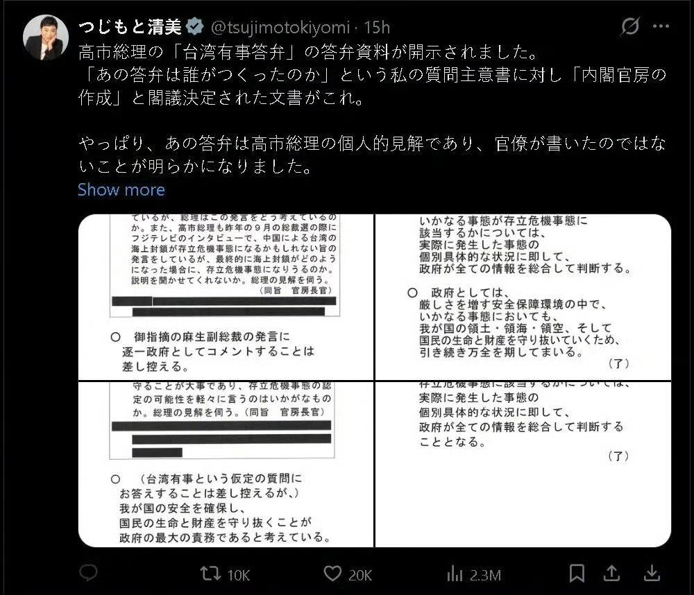 高市早苗涉台挑衅内幕曝光!无视内阁劝阻强行发声不良涉台言论,极右翼撑腰野心昭然! 日本首相高市早苗涉台挑衅言论的幕后真相终于浮出水面!这场引发中日关系紧张的风波,并非官方决策失误,而是她不顾内阁秘书处明确劝阻、执意发表的个人激进表态,其背后的极右翼背景更让外界警惕。 事件要追溯到11月7日的日本国会众议院预算委员会。当时在野党议员抛出关键提问,询问“台湾有事”是否构成日本“存亡危机事态”,是否会触发集体自卫权。此前,高市早苗的内阁秘书处已提前备好应答材料,明确建议她回避这一敏感问题,仅需笼统表态“台海和平关乎日本及国际社会稳定”,避免触碰外交红线。 但令人意外的是,高市早苗当场违背既定方案,公然宣称若中国大陆对台湾使用武力(如海上封锁),可能构成日本“存亡危机事态”,暗示自卫队或行使集体自卫权介入。这番言论直接突破日本政府长期以来的模糊立场,将台湾问题与日本国家安全强行绑定,引发中方强烈抗议和国际社会广泛关注。 随着日本《每日新闻》披露内幕,更多细节被曝光:这份关键的应答材料由立宪民主党籍参议员辻元清美在社交平台公开,她直言“那番答辩是高市早苗的个人见解,而非官僚起草”,直指其擅自越界。即便事后被追问是否收回发言,高市仍坚称“依据政府一贯立场,无意撤回”,仅表示“今后会避免假设特定情境”。 更值得警惕的是高市早苗的政治底色。作为日本右翼团体“日本会议”核心成员,她是坚定的历史修正主义者,不仅执着于参拜靖国神社,还否认“慰安妇”等历史问题;同时也是修宪“急先锋”,主张彻底恢复日本“交战权”和“国防军”。极右翼分子、自卫队退役将领田母神俊雄(曾洗白偷袭珍珠港事件)更是早于2024年10月就公开力挺她,称“更希望由高市早苗领导日本”,足见其背后的右翼势力支撑。 从法理层面看,高市的言论已构成三重越界:违反日本国内法律对“存亡危机事态”的定义(台湾并非“他国”)、背弃《中日联合声明》中的一个中国原则、践踏国际法尊重国家主权的基本准则。在日本国内,这一言论也引发轩然大波,最大在野党立宪民主党党首直呼“很危险”,《朝日新闻》社论警告其为扩大法律解释、推动军事扩张打开方便之门。 分析指出,高市此举本质是借涉台议题煽动民粹、巩固右翼支持基础,为其修宪扩军目标积累政治资本。近年来日本政治光谱持续右移,和平主义共识弱化,“鹰派竞赛”成为政坛常态,这也让高市的激进操作有了生存土壤。但将日本“存亡”与中国内政强行捆绑,无疑是将日本绑上“台独”战车,最终只会引火烧身。 目前,中日关系因这一事件遭遇新的挑战,国际社会也在密切关注日本右翼势力扩张带来的地区安全风险。高市早苗的任性挑衅,究竟是个人政治野心的冒进,还是日本对外战略转向的信号,仍需持续警惕。 创作训练营2期开营啦高市早苗挑衅内幕被曝光 中日动态 热点现场